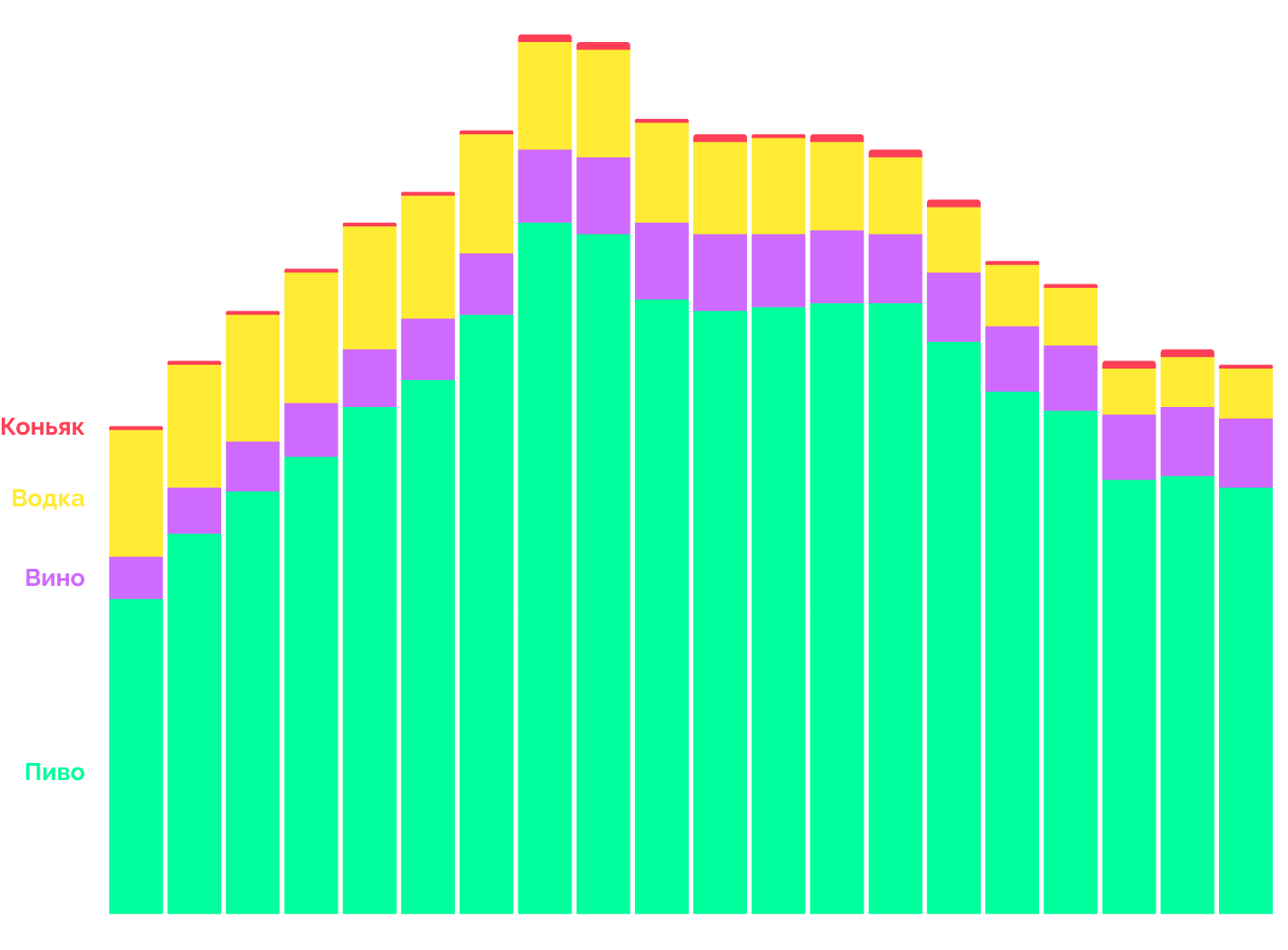 В абсолютном выражении (то есть в литрах) на рынке лидирует пиво, затем идет вино, главный алкогольный напиток русских — водка — лишь на третьем месте.