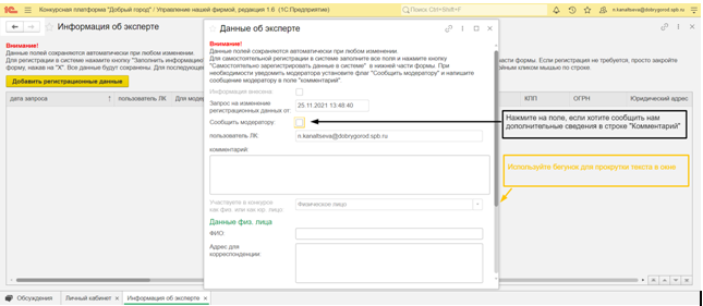 Пока у платформы есть ограничения: она создана не «с нуля» под все запросы пользователей, а на базе программы 1С. Интерфейс не всегда интуитивно понятен, иногда у пользователей возникают вопросы. Выручают заранее прописанные инструкции для участников и консультации сотрудников фонды (команда собирает обратную связь и делает пометки о том, что можно было бы улучшить). На основе полученных отзывов уже планируются небольшие изменения в интерфейсе.
