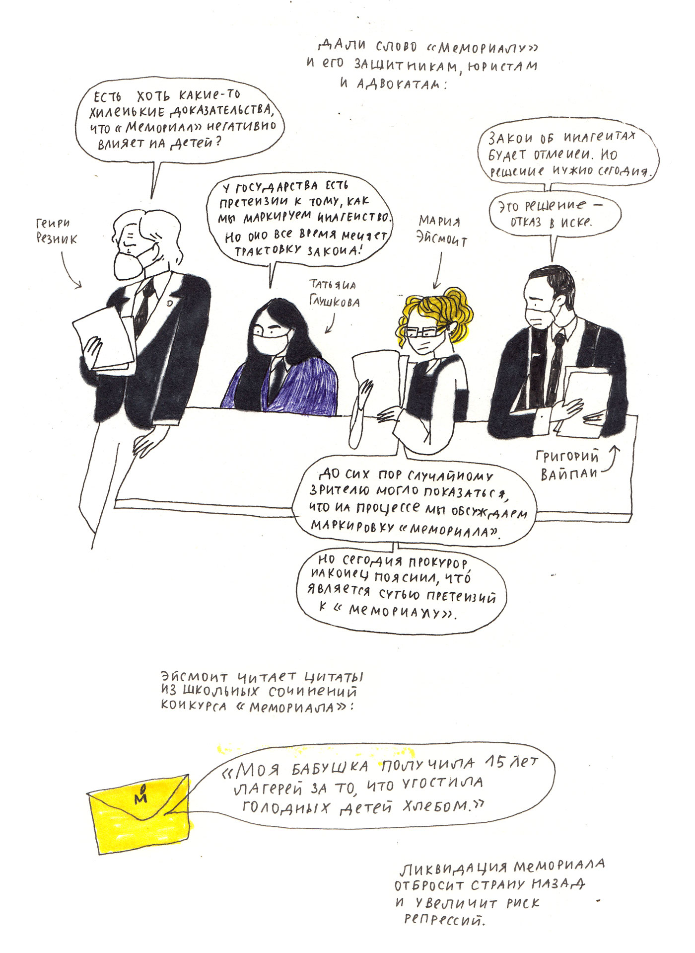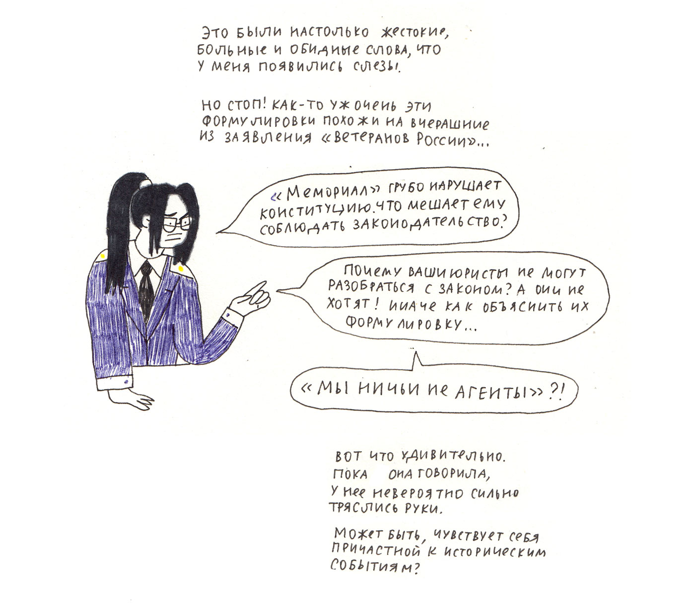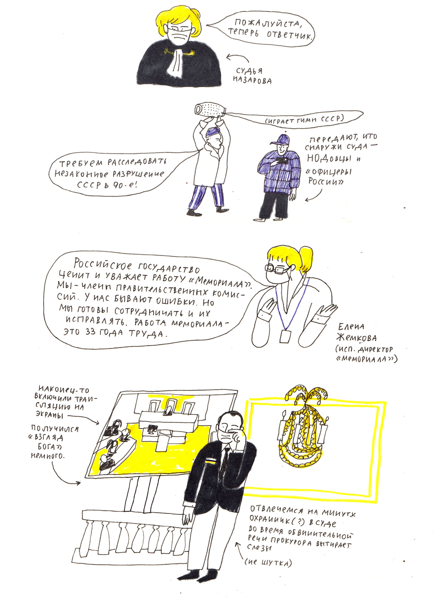 Судья Верховного суда Алла Назарова сегодня вынесла решение о ликвидации — организации, которая больше тридцати лет занимается изучением советских репрессий. Художница Катя Гущина зарисовала в зале суда, как прокуроры пеняют «Мемориалу», что он неправильно трактует советскую историю, «создает лживый образ СССР как террористического государства» и «обрушивает критику на органы государственной власти».