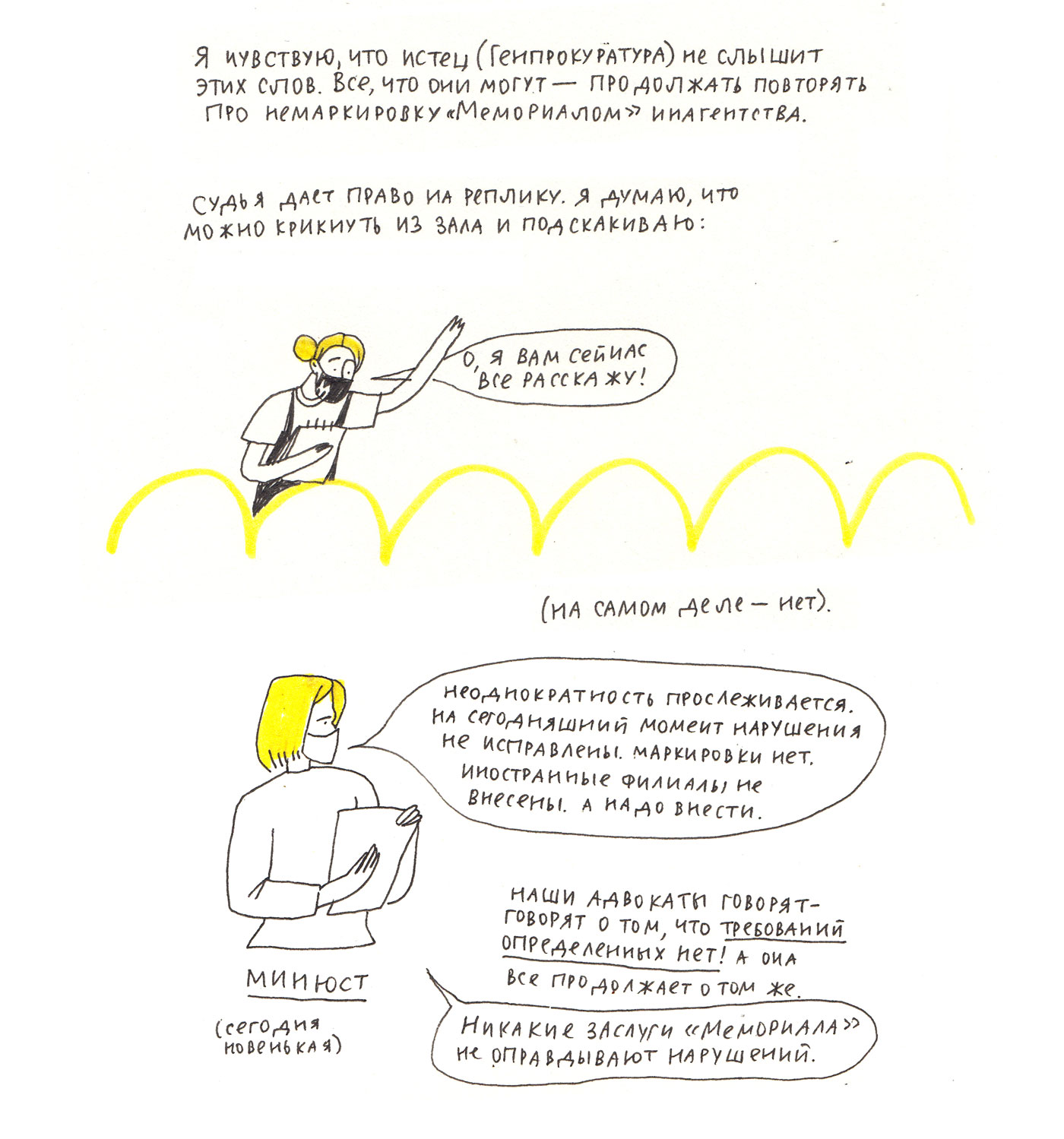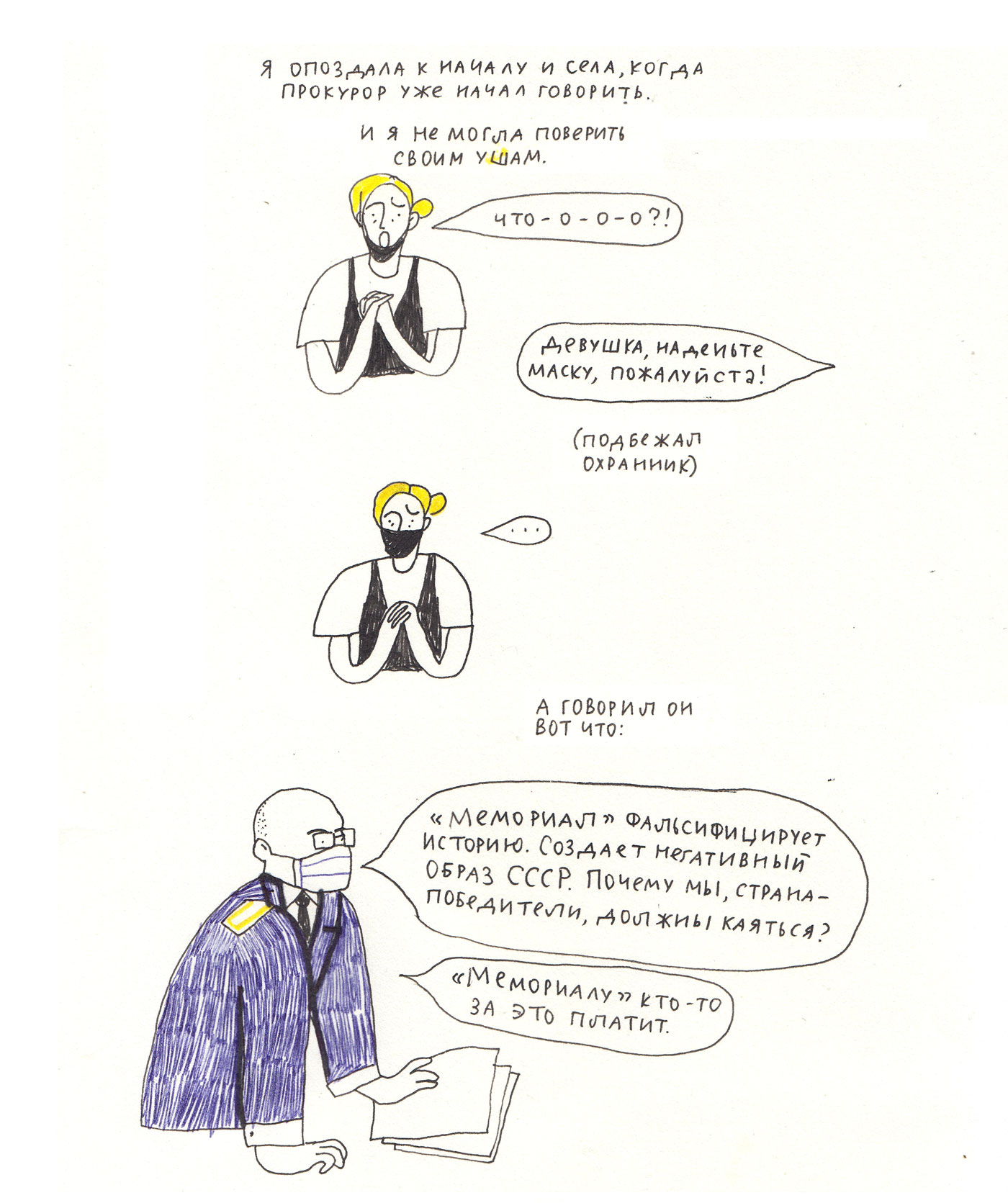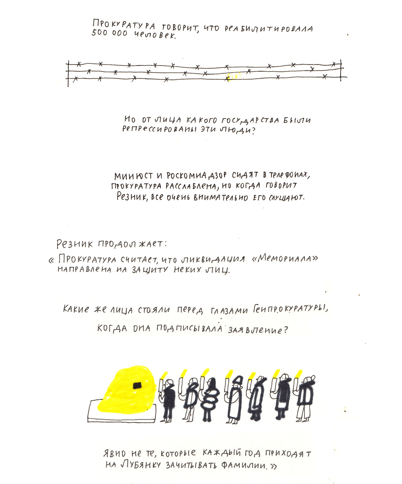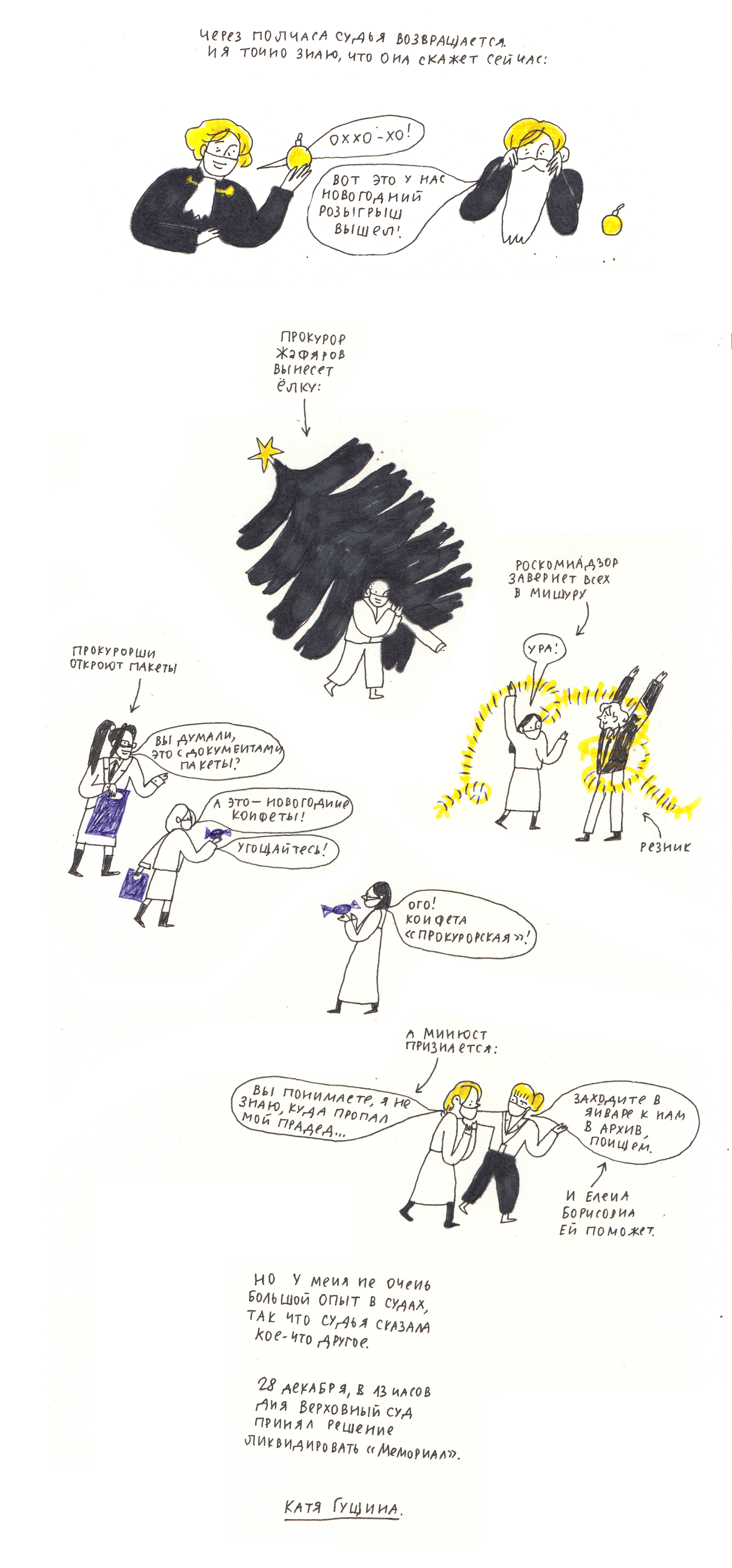 Судья Верховного суда Алла Назарова сегодня вынесла решение о ликвидации — организации, которая больше тридцати лет занимается изучением советских репрессий. Художница Катя Гущина зарисовала в зале суда, как прокуроры пеняют «Мемориалу», что он неправильно трактует советскую историю, «создает лживый образ СССР как террористического государства» и «обрушивает критику на органы государственной власти».
