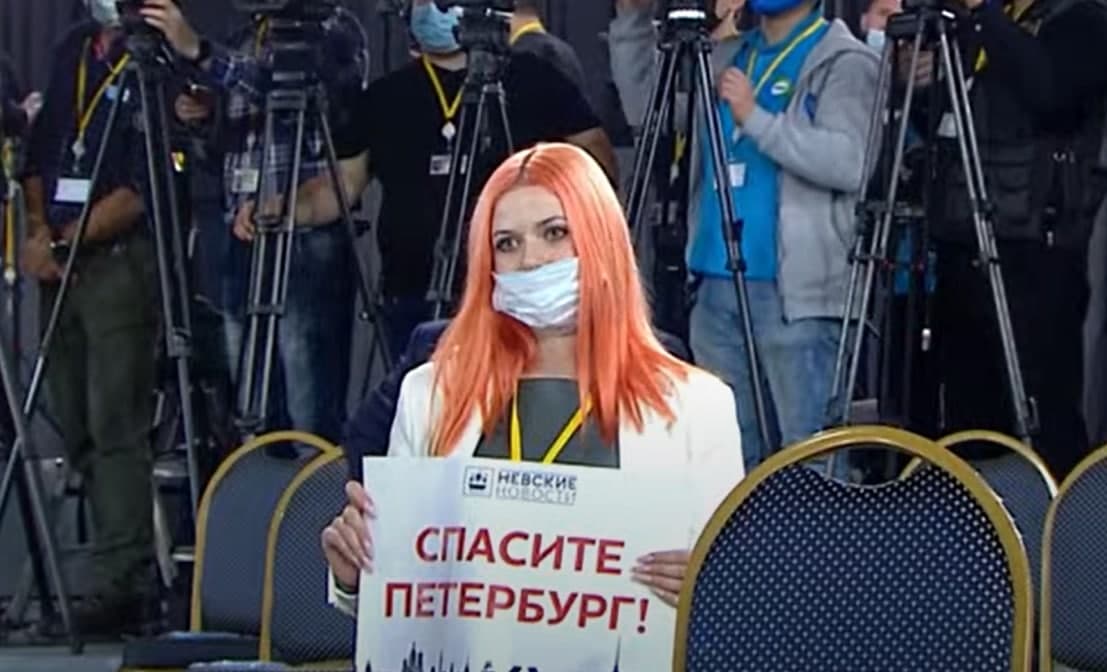 На пресс-конференции Владимира Путина 23 декабря журналистка «Невских новостей» сидела с плакатом «Спасите Петербург!».