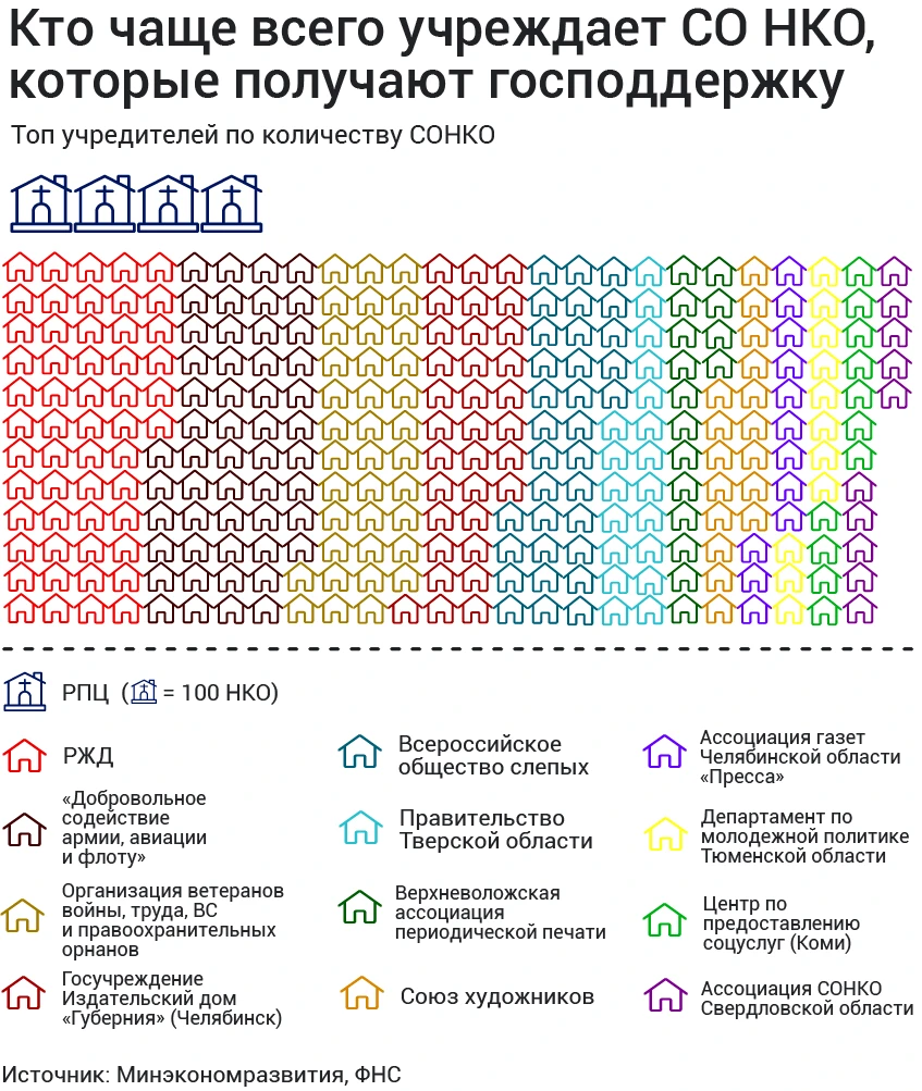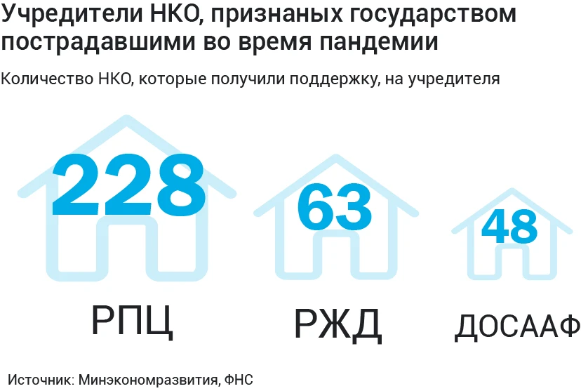 В результате список учредителей, пострадавших от коронавируса, НКО похож на список СОНКО: его возглавляют РПЦ и крупные ГОНГО — РЖД и «Добровольное содействие армии, авиации и флоту».