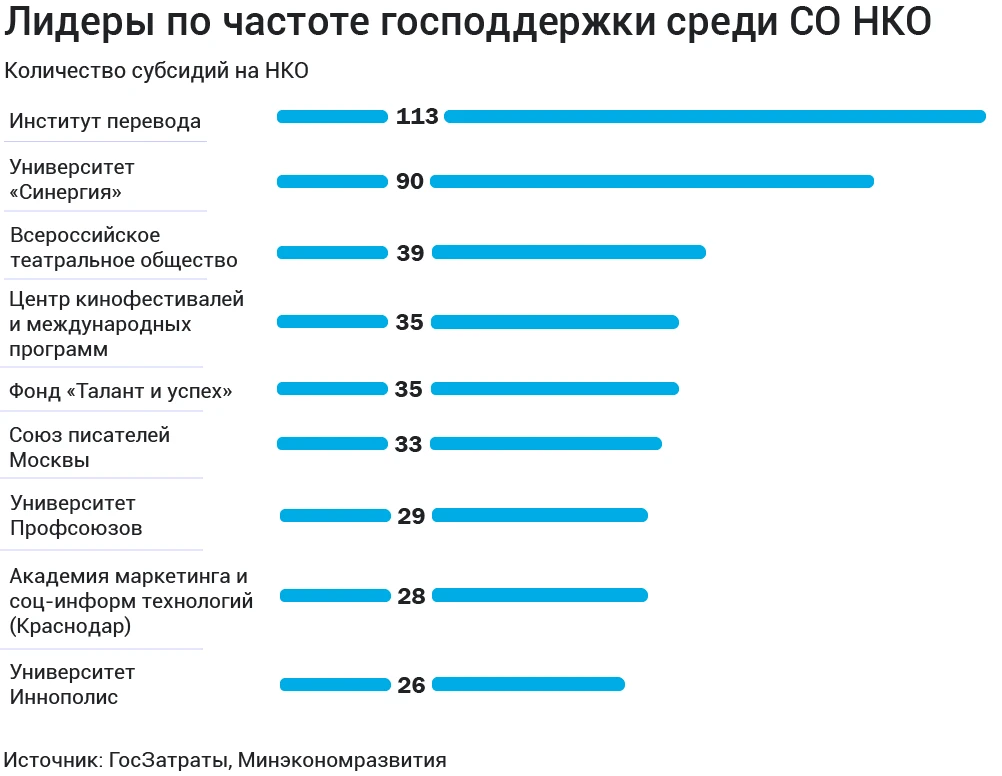 Лидер по частоте субсидирования — Институт перевода — принадлежит трем государственным вузам: РГГУ, МГУ, Литературному институту им. Горького, а также телекомпании «ТВ-Новости». Другая ГОНГО, которую власти активно поддерживают, — краснодарская Академия маркетинга — тоже принадлежит государственному вузу — местному Институту культуры.