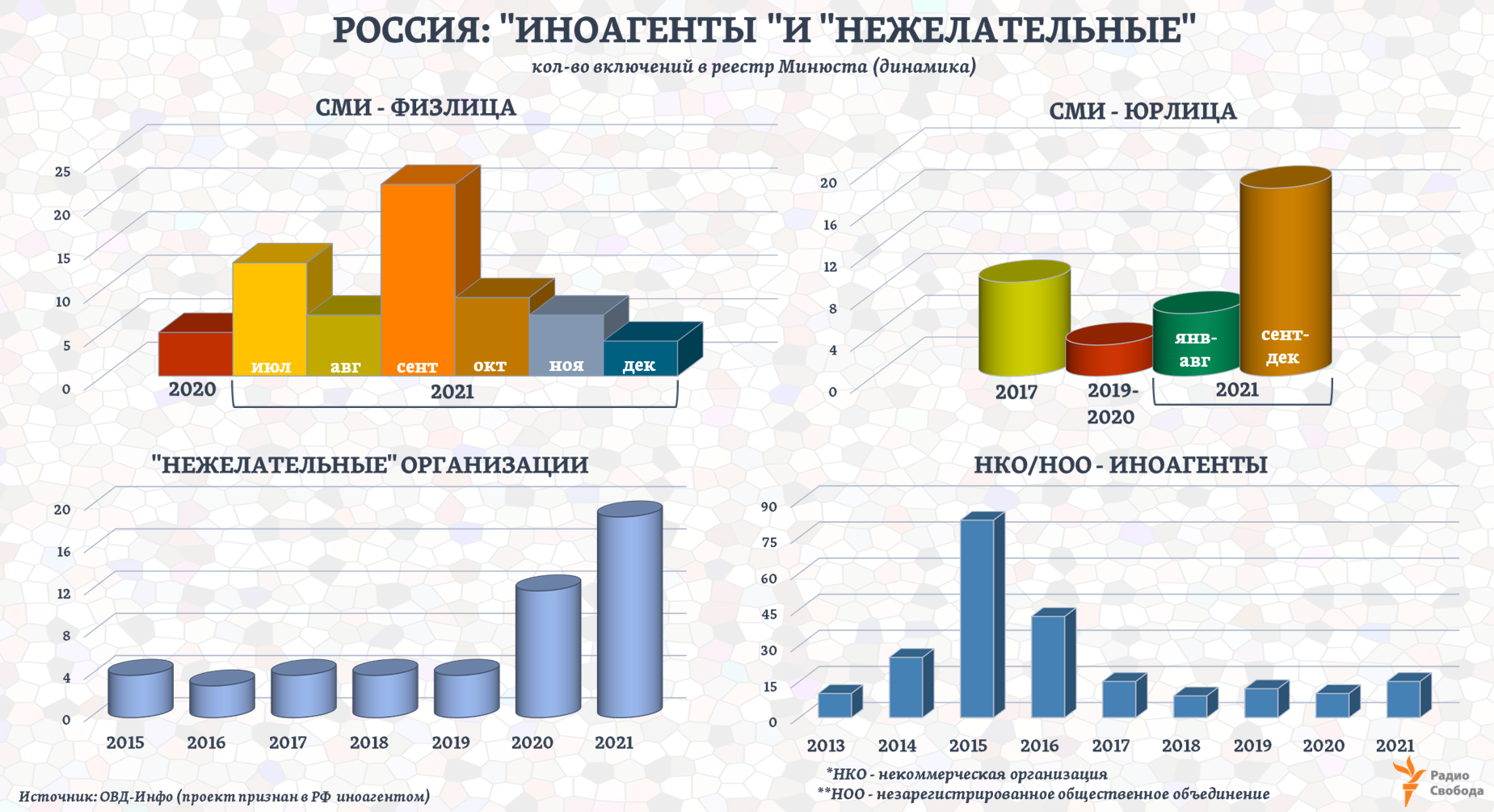 Власти России в 2021 году существенно увеличили темпы включения граждан и организаций в реестр так называемых СМИ-"иностранных агентов". На 31 декабря 2020 года в этом реестре было 17 записей, из них 10 относились к проектам медиакопорации Радио Свободная Европа/Радио Свобода. На 30 декабря нынешнего года в реестре СМИ-"иноагентов" в России 103 позиции, в том числе десятки физических лиц - это журналисты, активисты, правозащитники.