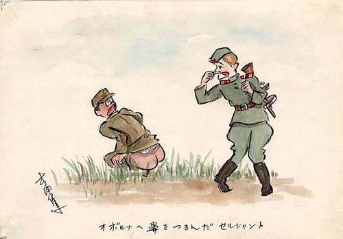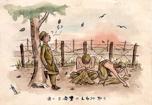 Показателен рисунок бывшего воздушного десантника Киути Нобуо. Он нарисовал себя, справляющим нужду рядом с охранником, сопроводив текстом: "Что толку говорить ему, что мне нужно в туалет, он все равно не понимает слов. Боясь, что могу сбежать, он всегда смотрел, что я делаю, стоя рядом. А у меня из-за этого сам процесс никак не получался". Киути Нобуо смеется над ситуацией, ведь страдают обе стороны – не только пленник, но и охранник, вынужденный мириться с неприятным запахом. Он испытывает те же прелести тюрьмы, что и заключенный.