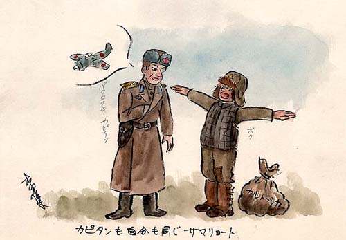 "В мокрые от снега портянки совсем молодой солдат заворачивает ноги. Я отдал ему одну пару носков, обычно я надевал сразу две пары. Спросив его, сколько лет, получил ответ: 14. Солдат растирал двумя руками почти отмороженные ноги, а в его голубых глазах стояли слезы. О маме, наверное, вспоминал". Ни один зэк ГУЛАГа никогда не подарил бы свои носки охраннику. Если бы у него случайно и оказалась пара лишних носков, зэк обменял бы их на хлеб или махорку. А японский военнопленный видит в конвоире не врага, а такого же угнетенного, как он сам, и сочувствует ему, поскольку считает себя сильнее, чем юный охранник.