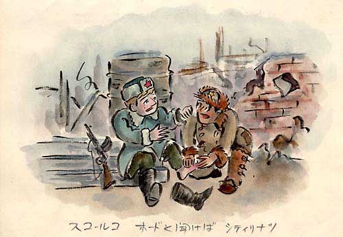 – Конечно. Даже браки японцев с русскими девушками были не такой уж редкостью. По данным одного из экспертов по вопросам японского плена в СССР Сергея Кузнецова, в одном только городе Канске Красноярского края осталось около 50 бывших солдат Квантунской армии, женившихся на местных женщинах. Однако далеко не всем удавалось получить разрешение остаться в СССР. Да и не все в принципе имели такое желание: подневольный статус снимал с военнопленного всякую ответственность за будущее. Недаром Киути Нобуо нарисовал такую сценку: беременная женщина с грустью провожает уходящий эшелон. Подпись под рисунком гласит: "Не плачь, Наташа. Любая встреча неизбежно влечет за собой расставание. Кажется, там была девушка, боевая подруга, для которой это расставание было особенно больно. И ты, Наташа, что так горько шепчешь слова прощания, что ты сейчас делаешь, что с тобою, бедная, стало?"