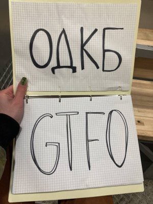 19:17 Около памятника Абаю задержали еще одного пикетчика — Федора Кокорева. Он держал в руках два тетрадных листа с надписью «ОДКБ GTFO». Его поместили в автозак, который выехал в отдел полиции по району Хамовники.