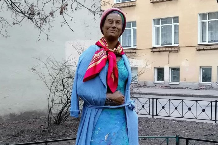 Это Коломенская Венера — скульптура, которая постоянно меняет облик. Ее раскрашивают, наряжают в халаты и бусы — и даже в противогаз