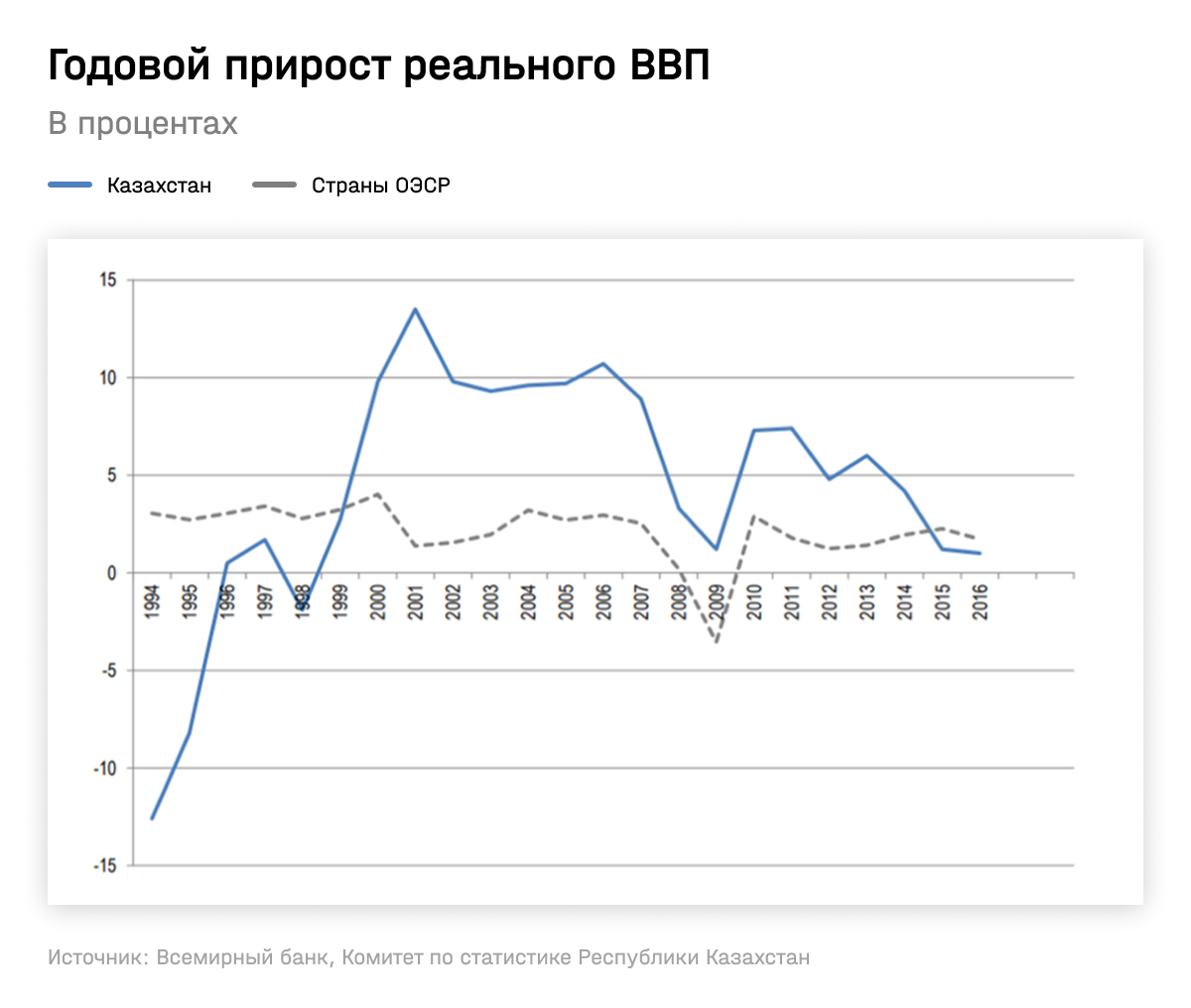 В течение 2000-х и большей части 2010-х экономика Казахстана демонстрировала быстрый (и значимо превышающий российские темпы) рост. Между 2000 и 2008 годами среднегодовой рост ВВП Казахстана составил 9,4% (ВВП России — около 7%). В 2009 году рост почти обнулился, затем снова шел вверх — до падения цен на сырье в 2014–2015 годах, когда обвал цен на нефть привел к замедлению и падению экономики до 1% в 2016 году. Но с 2017 по 2019 годы темпы роста экономики Казахстана снова превышали 4%.