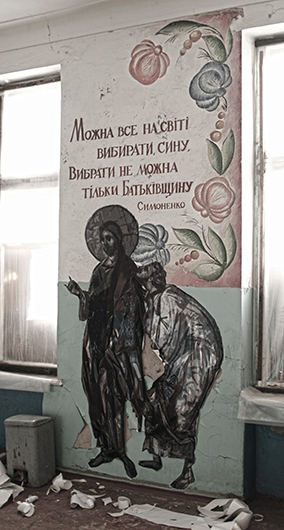 Я поехал в Донбасс в 2016 году, в прифронтовое Зайцево, и сделал там страстной цикл в разбитой артиллерией школе. Правильное ли это было место? Не осквернят ли там эти образы? Я не знаю. Сделал, потому что так было нужно. Разрешения ни у кого не спрашивал.