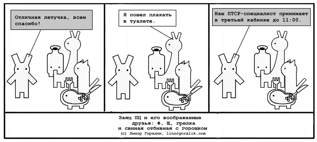 Линор Горалик уже 18 лет рисует комиксы про Зайца ПЦ и выпустила три книги о нем. Смотрите, Заяц ПЦ — он алкоголик, он не очень хорошо образован, при этом у него есть на всё свое мнение, и вы о нем регулярно выпускаете комиксы. По средам, раз в неделю. Там бывают комиксы с другими персонажами: с Грелкой, со Свиной отбивной с горошком и так далее.