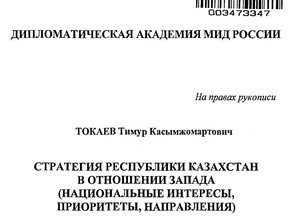 В интернете можно найти диссертацию Тимура Токаева, которую он защитил в академии МИДа в 2009 году: "Стратегия республики Казахстан в отношении Запада. Национальные интересы, приоритеты, направления". Фамилия Назарбаева упоминается в ней 112 раз на 215 страницах. Путин встречается 1 раз, Обама – 6, Буш – 14 раз. "Россия – единственный союзник Казахстана", – пишет Токаев-младший.
