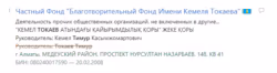 Тимур Токаев связан с несколькими юридическими лицами в Казахстане, свидетельствуют данные бизнес-реестров. В том числе он является руководителем благотворительного фонда имени своего деда, Кемеля Токаева. На сайте фонда он представлен как член правления.