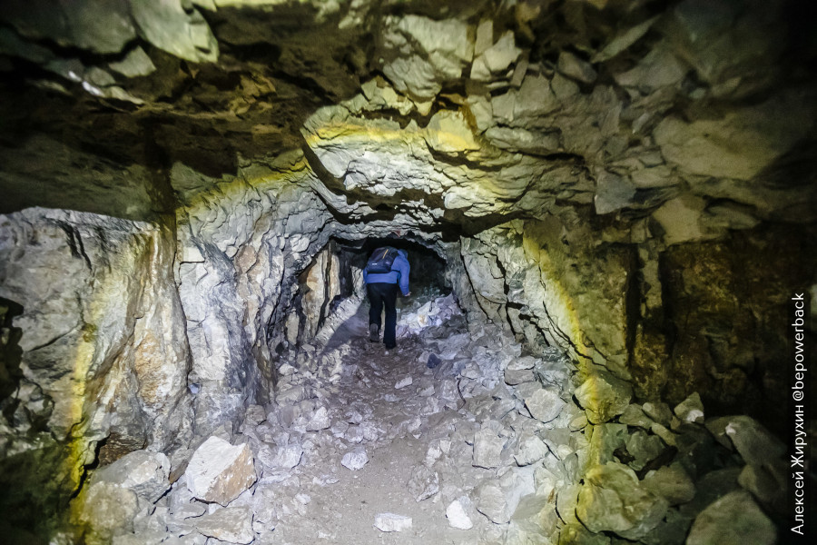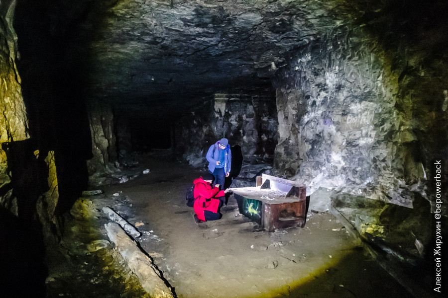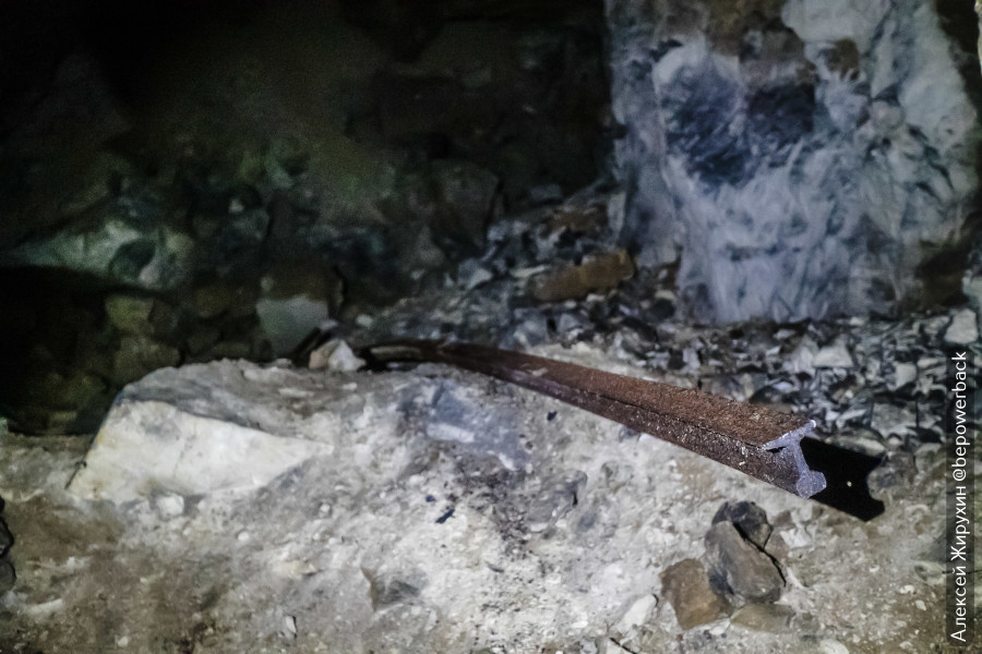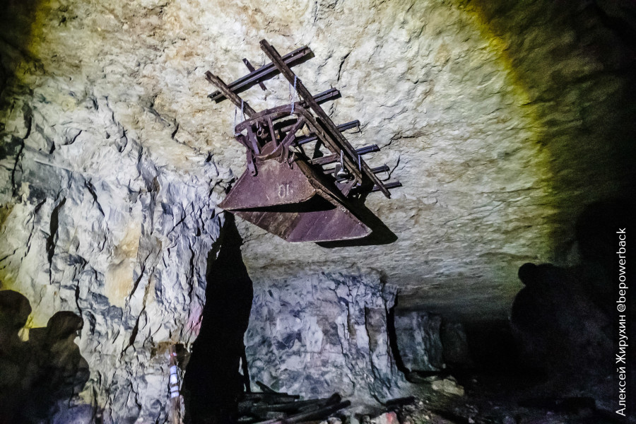 Их тянули дизельные мотовозы. Останки одного из них тут тоже можно найти. Специалисты определили, что на этом мотовозе был установлен двигатель под мотопомпу производства Андижанского машиностроительного завода. Кстати, вагонетки еще таскали на лошадях, в штольнях можно найти подковы.