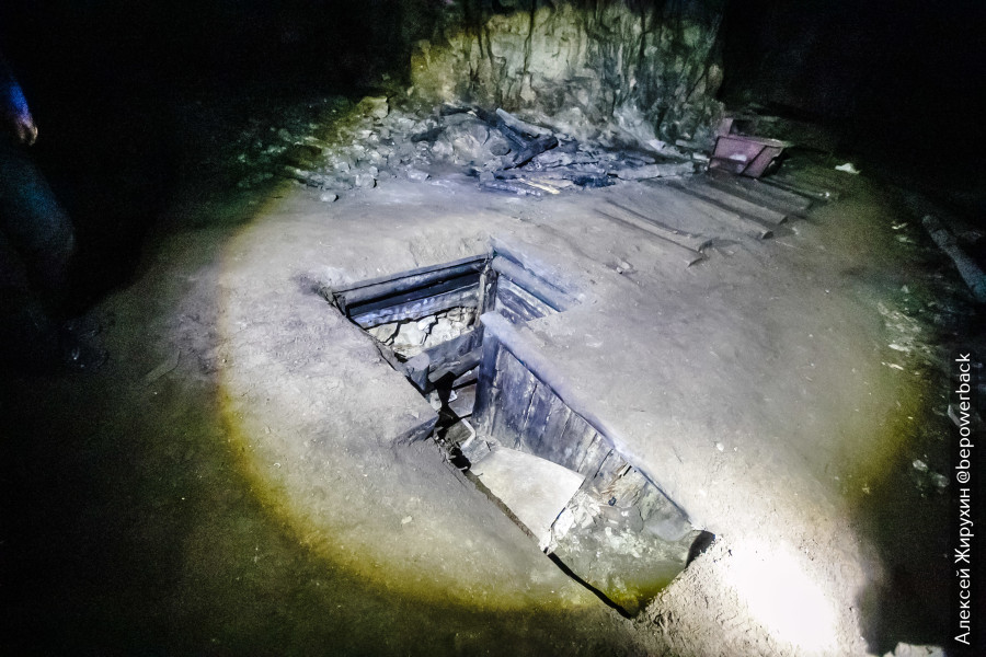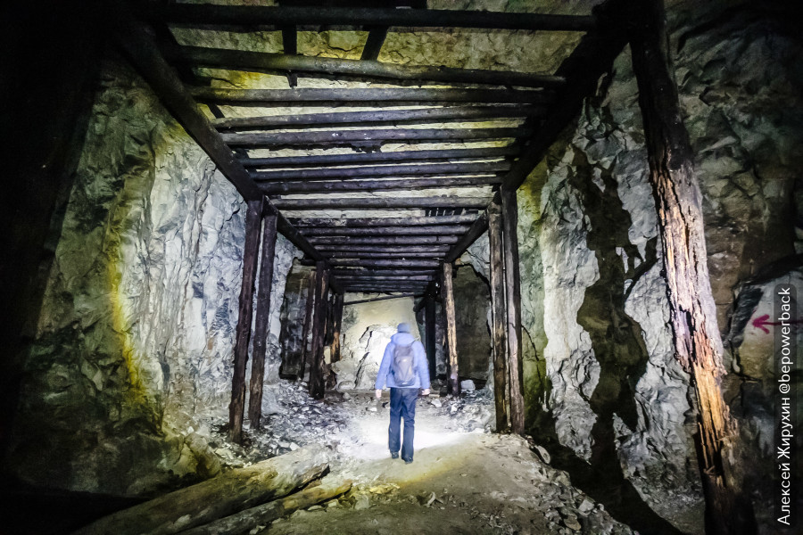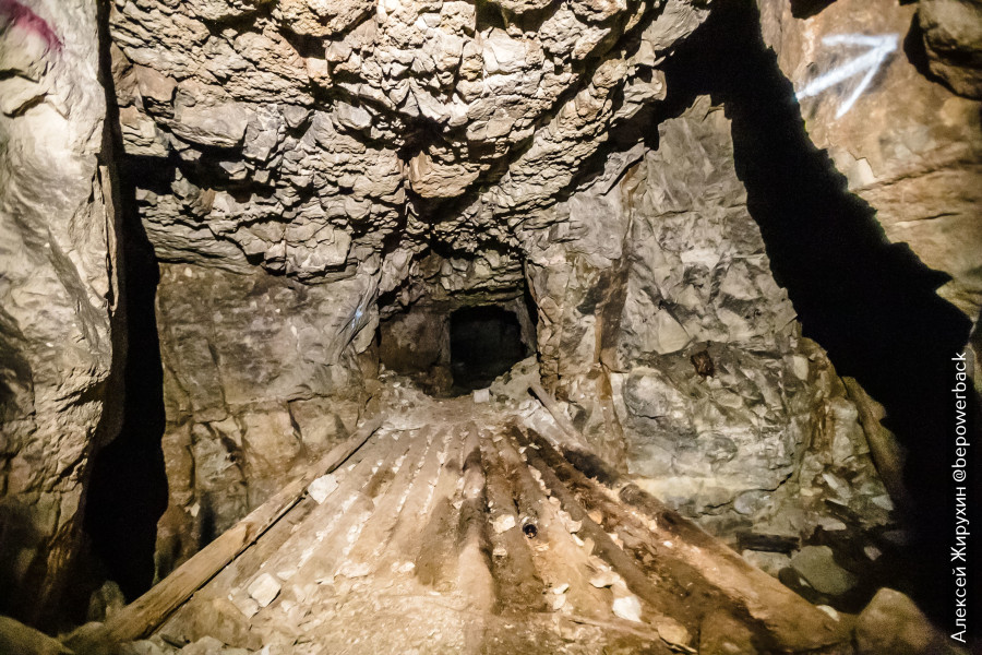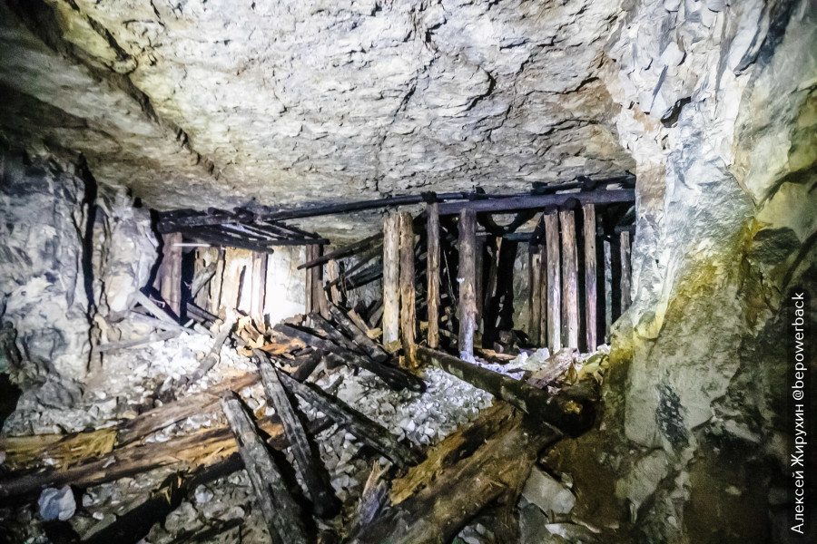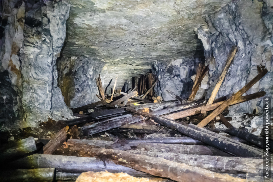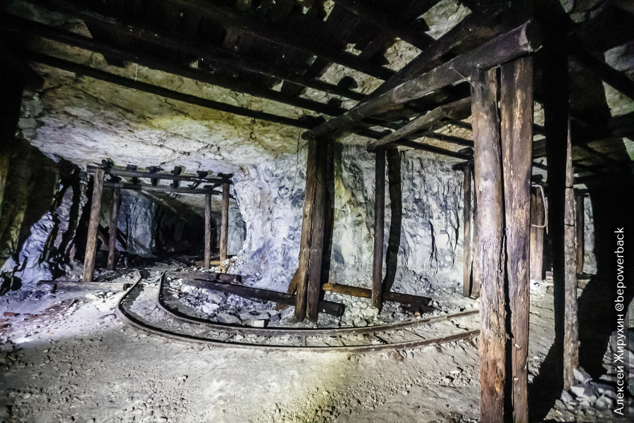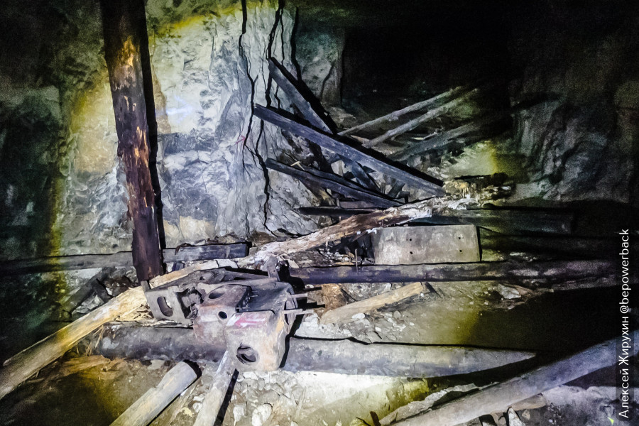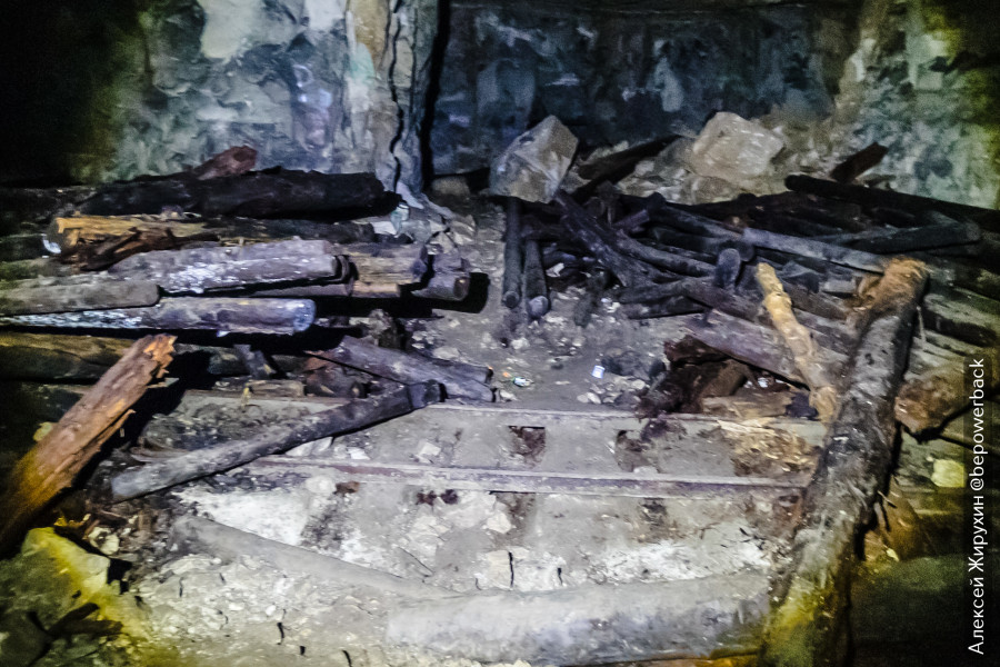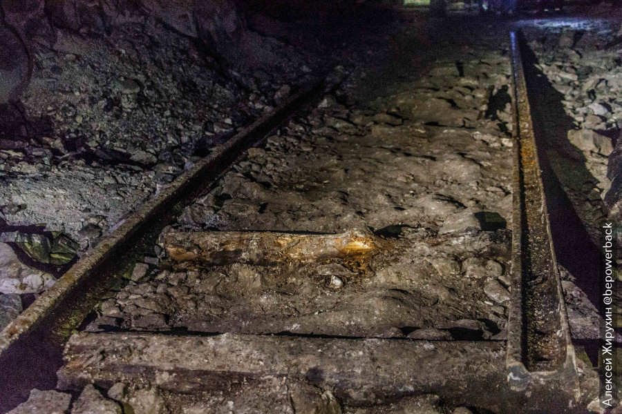 В некоторых штольнях от старости и влаги такая конструкция развалилась, но под бревнами можно увидеть сохранившиеся пути.