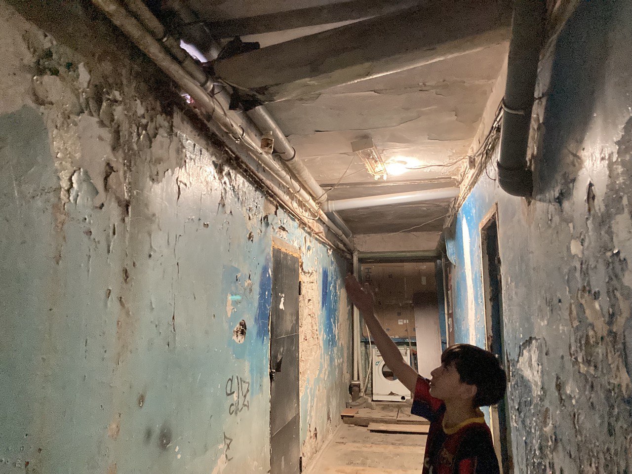В доме разрушены несущие стены, нет вентиляции, из-за чего в душевых постоянная влажность, плесень и тараканы. Многие обитатели дома уже переболели туберкулезом. В доме горит проводка, на лестничных пролетах выпадают окна и отсутствуют батареи, из-за чего на стенах образуется наледь.