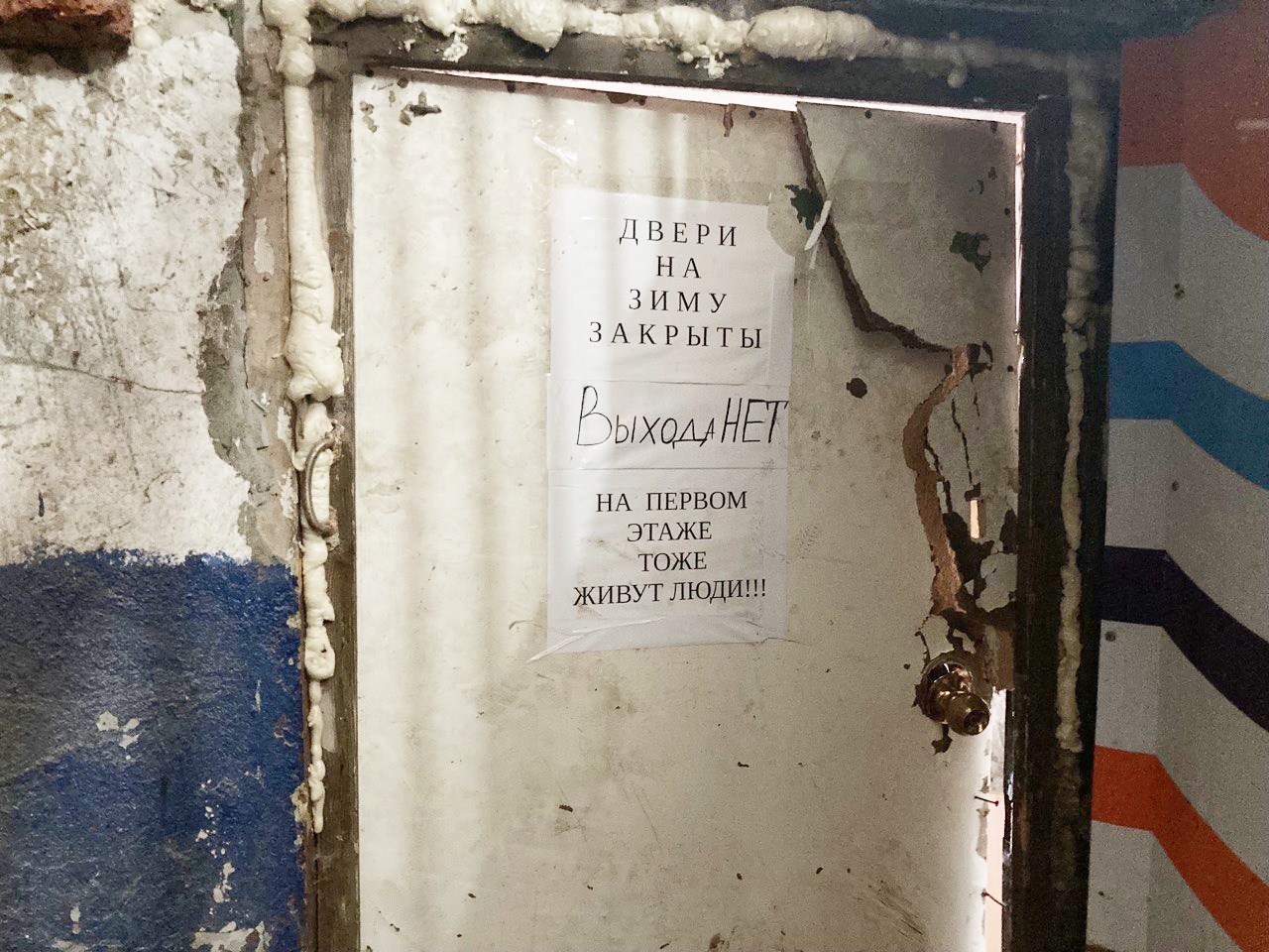 Входные двери в общежитии не закрываются вообще, из-за чего своим этот дом считают и бездомные.