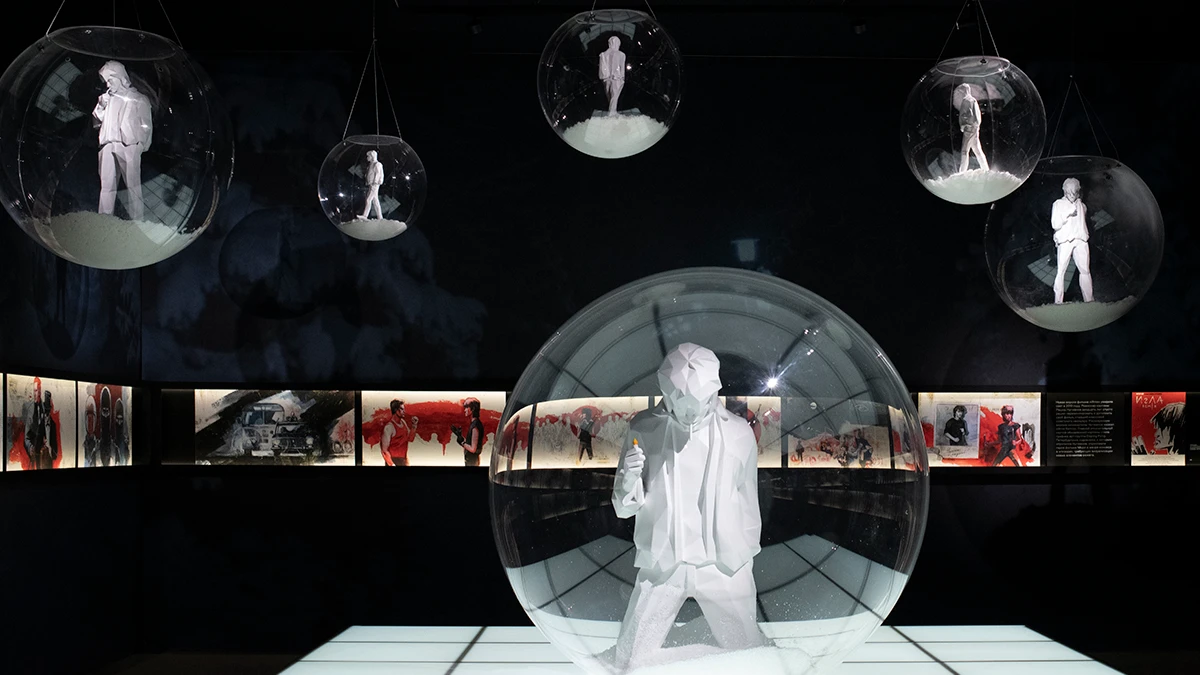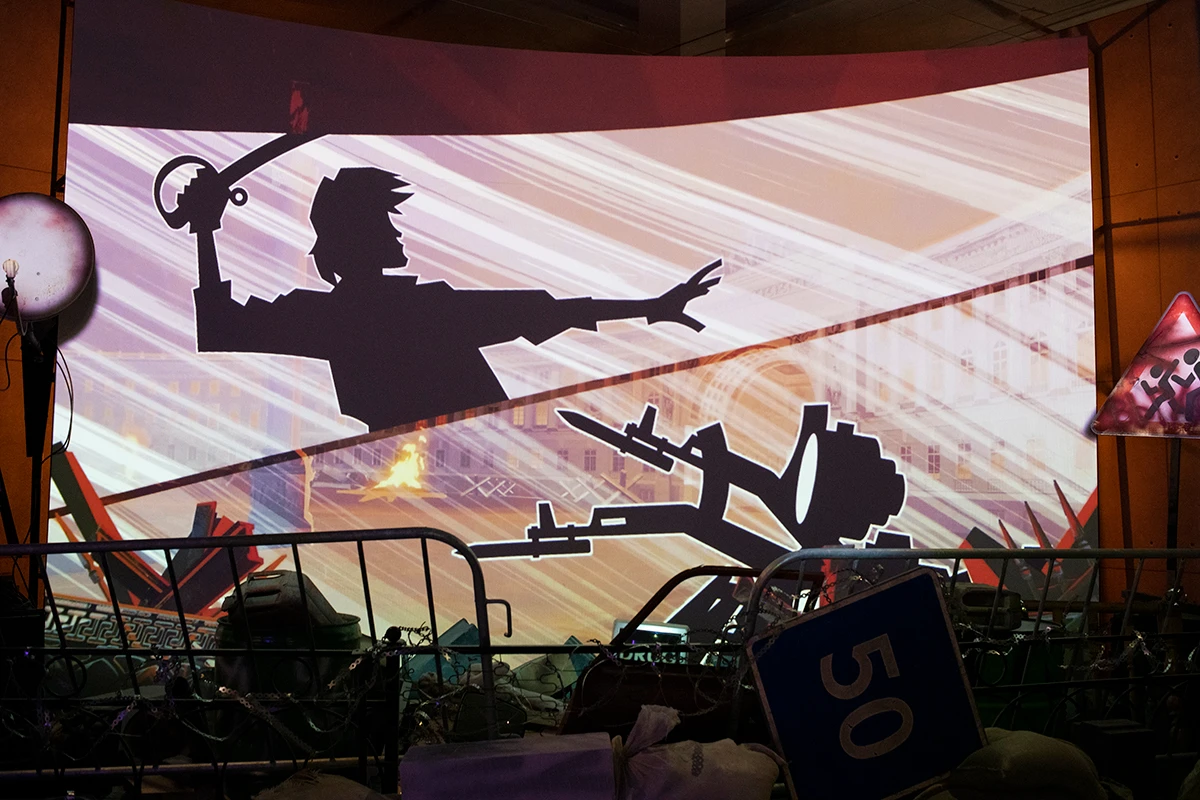 На выставке представлены декорации неснятого фильма: Дворцовая площадь, а вокруг — баррикады, колючая проволока, следы от взрывов. И Цой, спасающий этот мир.