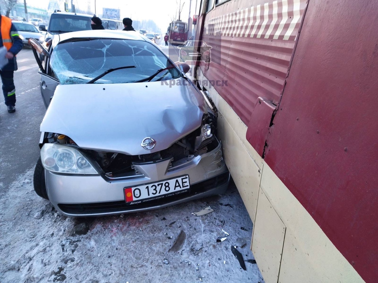 В Красноярске Nissan столкнулся с трамваем и автобусом: МАЗ врезался в пешеходное ограждение