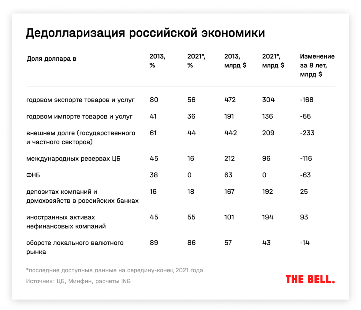 - Минфин поступил еще более радикально, полностью отказавшись в 2021 году от доллара в суверенном ФНБ: его доля снизилась с 38% в 2013 году ($63 млрд) до нуля.