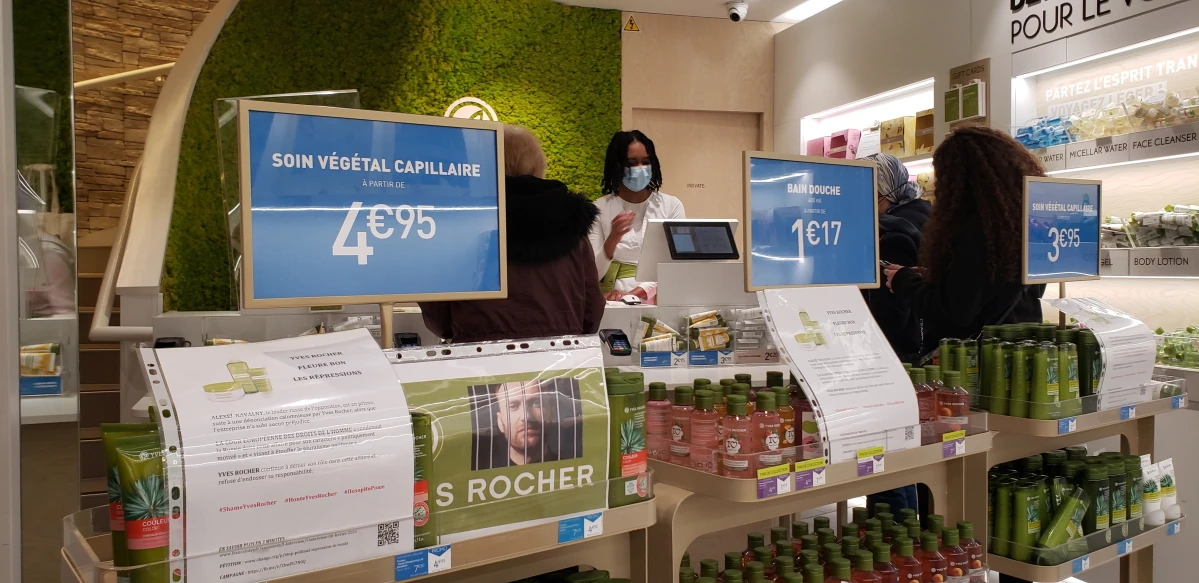 Листовки о роли парфюмерной компании в уголовном преследовании братьев Навальных на прилавке магазина Yves Rocher на Елисейских полях в Париже. Февраль 2021 г. Фото: Максим Филандров