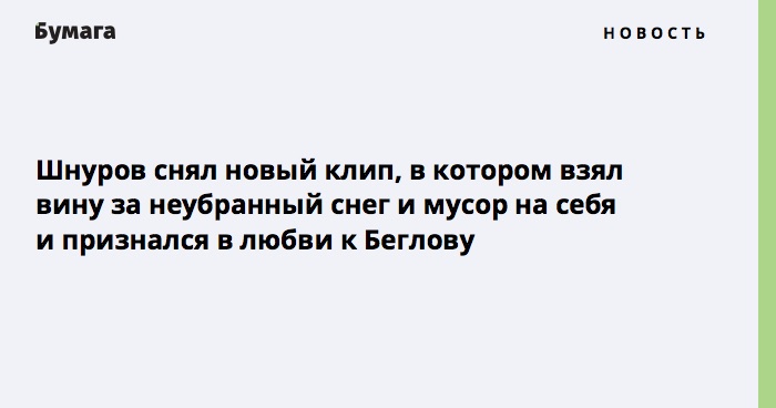 Сергей Шнуров представил новую песню «Покаянная», в которой взял вину за неубранный снег и мусор на себя и признался в любви к Беглову. Клип опубликован в ютьюб-канале группировки «Ленинград».