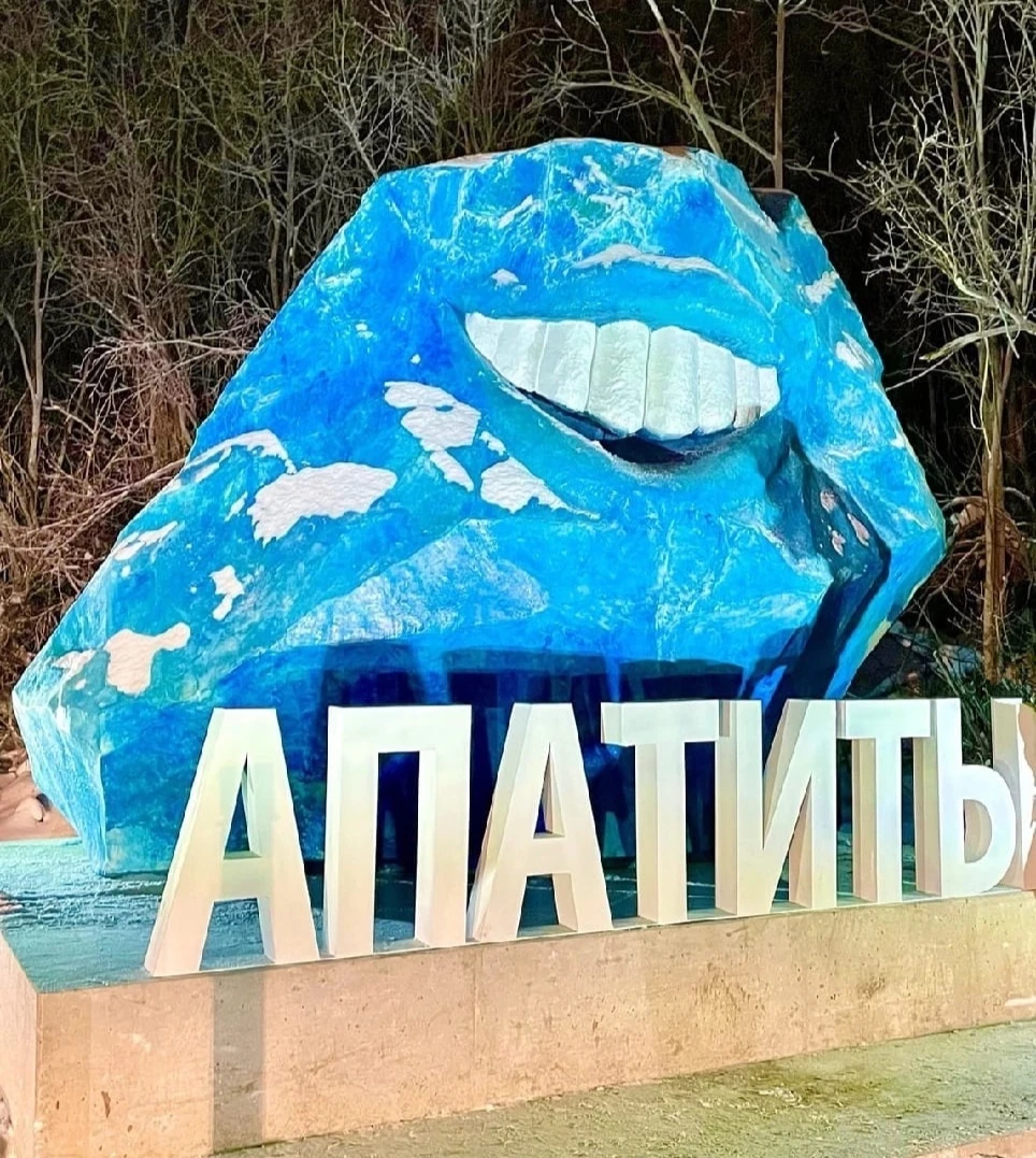 Под елочкой на въезде в город Апатиты появилось «оно». На обочине притаился ярко-голубой зубастый камень метра два в высоту. Газета областного правительства уточнила, что булыжник на самом деле пластиковый, работа украинского фотографа и автора инсталляций Сергея Браткова. А зубы на странном голубом объекте — чьи надо зубы: улыбка Андрея Малахова (ведущий ток-шоу — уроженец Апатитов). Иван Ургант по этому поводу предложил менять зубы к разным праздникам: сделать золотыми или убрать один ко Дню ВДВ. Местные СМИ уверяли, что каменюку сам Малахов и подарил родному городу. Но через некоторое время обнаружилось, что шоумен хоть и причастен к ее появлению, но несколько иначе: за «подарок» директору малаховского центра современного искусства «Сияние» Степану Бугаеву финансируемая из казны региона АНО «Центр городского развития» заплатила 5 миллионов. Историю совместными усилиями раскопали мурманские блогеры (подтверждающие документы — в распоряжении «Новой газеты»).