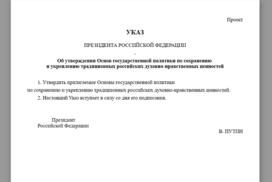 Предложения по проекту указа президента РФ «Об утверждении Основ государственной политики по сохранению и укреплению традиционных российских духовно-нравственных ценностей», которые сейчас проходят этап общественного обсуждения, в дальнейшем будут обсуждаться на площадках верхней и нижней палат парламента, в Общественной палате РФ и в других инстанциях.