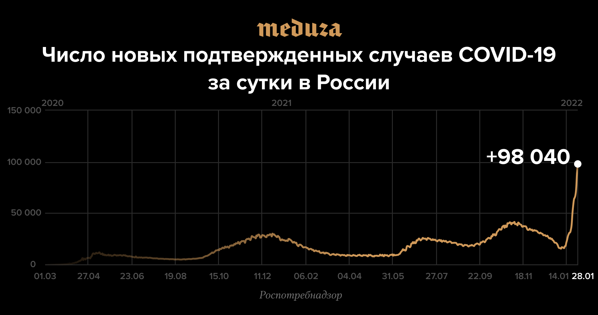 По данным федерального оперативного штаба по борьбе с COVID-19, за прошедшие сутки выявлено 98 040 новых случаев коронавирусной инфекции. В России уже неделю ежедневно обновляются рекорды суточной заболеваемости ковидом.