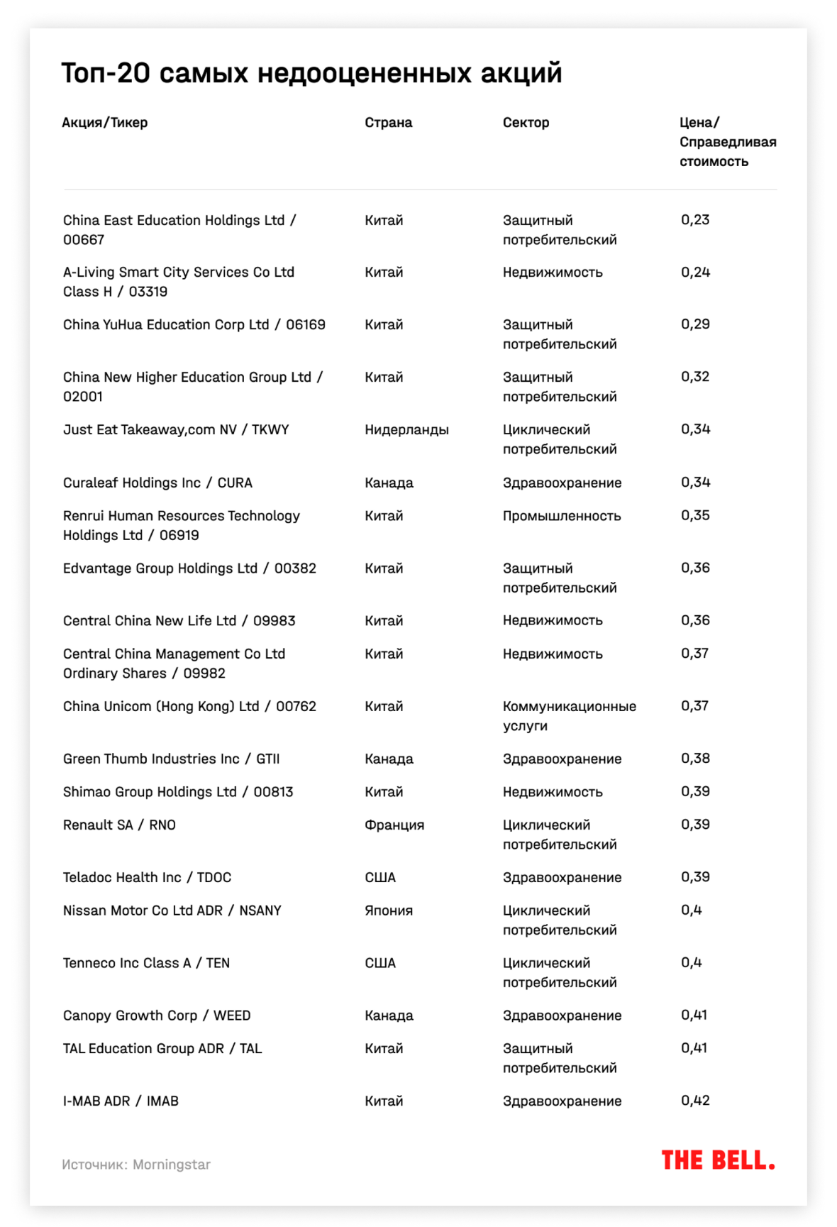Китайские акции в среднем торгуются сейчас с дисконтом в 16% к их справедливой цене против премии в 5% в начале 2021 года, отмечает Morningstar. По данным Morningstar Direct, 60% из 143 акций компаний материкового Китая, за которыми следит компания, недооценены. Хуже всего ситуация у компании China East Education Holdings, которая, по мнению Morningstar, торгуется на 78% дешевле своей справедливой цены. За ней идет A-Living Smart City Services с дисконтом 77%. Обе компании представляют сектор образования, который в прошлом году оказался под регуляторным давлением.