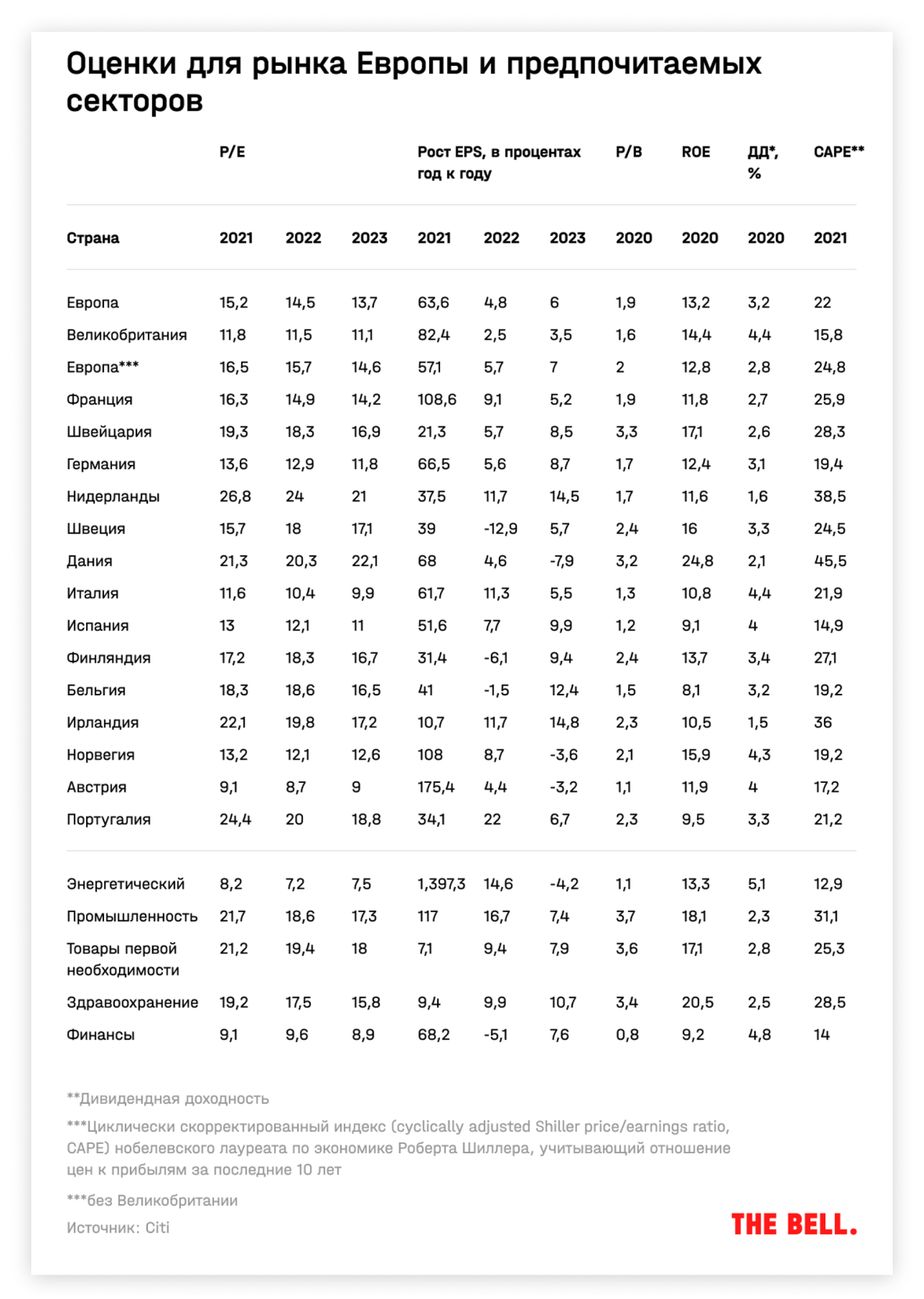 Citi позитивно смотрит как на акции Европы без Великобритании, так и на бумаги самой Великобритании. По мнению банка, оба региона выиграют от низких оценок по сравнению с другими развитыми рынками. По этой же причине Citi отдает предпочтение Германии, а также выделяет Швейцарию, которая торгуется с премией, но банк считает, что стране удастся сохранить высокую оценку. Среди секторов Citi предпочитает энергетический, промышленность, финансы, здравоохранение и производство товаров первой необходимости.