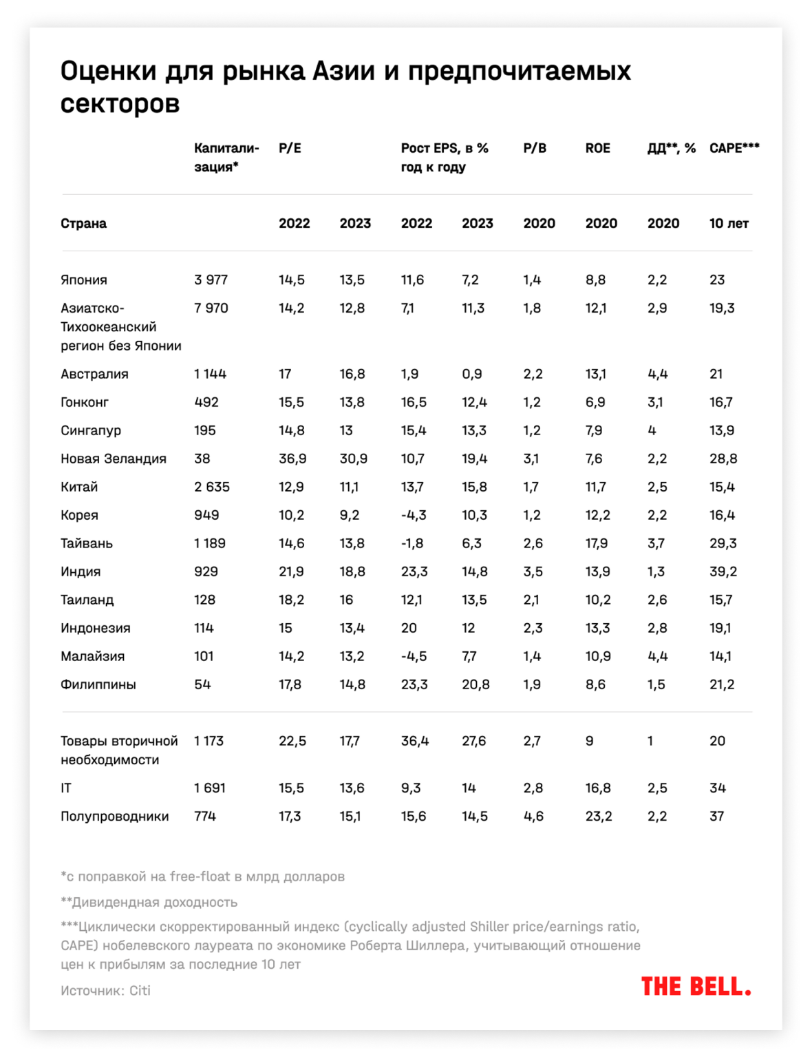 Citi отдает предпочтение в регионе Китаю, Гонконгу и странам Юго-Восточной Азии, среди секторов — IT, производителям полупроводников и товаров второй необходимости. Банк предполагает, что самое худшее в истории с регулированием китайского технологического сектора уже позади и сейчас рынки ждут, когда компании вернутся к росту прибыли. По мнению Citi, это произойдет в первой половине 2022 года. Кроме того, смягчению политики может способствовать проведение ХХ съезда Компартии Китая в этом году, отмечали аналитики.