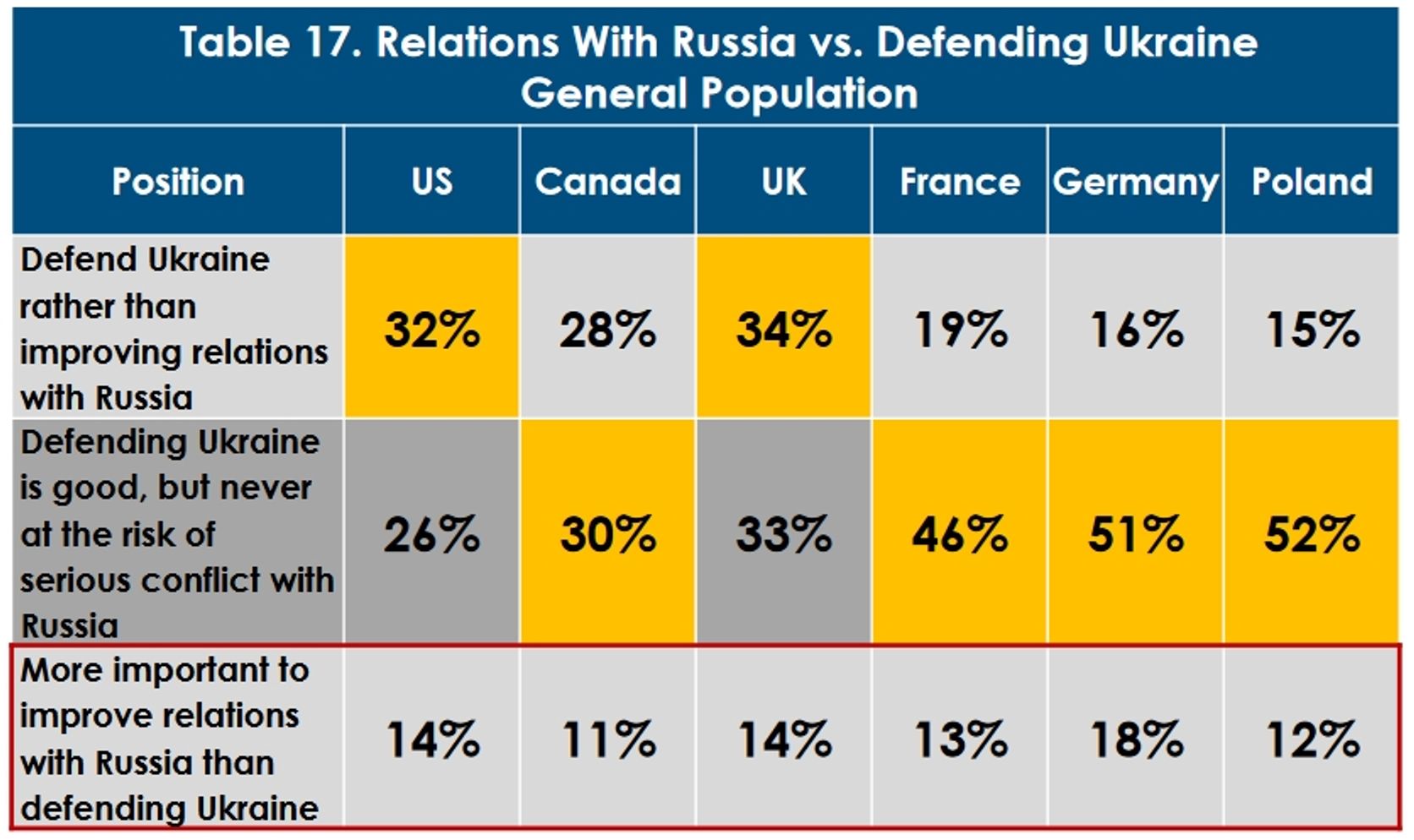 Жители западных стран также считают более важным защищать Украину и демократические ценности, чем поддерживать хорошие отношения с Россией. За поддержку Украины выступают 71% поляков, 65% американцев, 63% канадцев, 59% британцев и немцев, 53% французов. Однако при этом жители западных стран не хотят, чтобы такая поддержка Украины обернулась открытым конфликтом с РФ. Наиболее сильны такие опасения в странах ЕС (Франции, Германии и Польше), там страхи перед открытым противостоянием с Россией выражали от 46% до 52% опрошенных. В государствах, не входящих в ЕС, такое мнение выражали не больше трети респондентов.