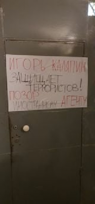 На одном из плакатов, который повесили на двери подъезда, написано «Игорь Каляпин — иностранный агент! Продал отечество за гранты США и Германии».
