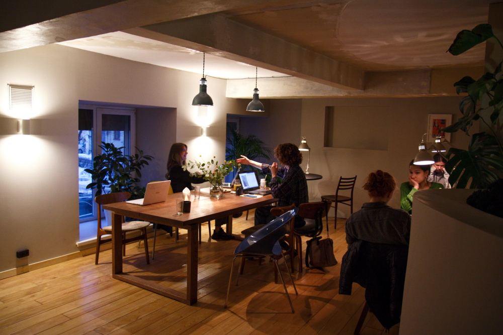 Кофейня находится в конструктивистском доме для специалистов-иностранцев «Иностранный ударник». Пространство разделили на две зоны с помощью антресоли. В оформлении кофейни использовали живые растения и деревянные элементы.