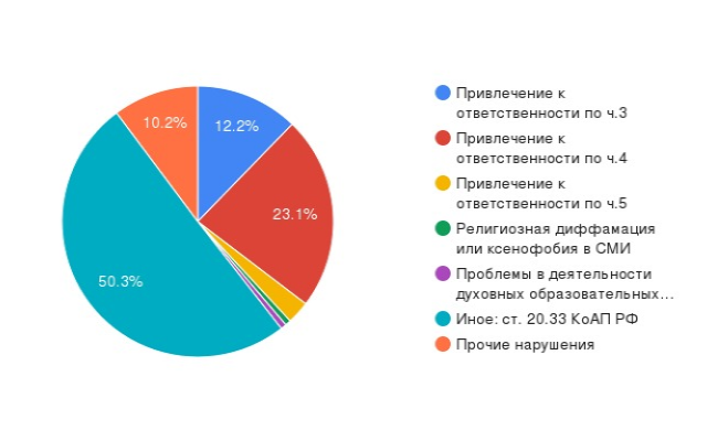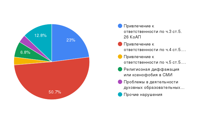 В 2020 году к административной ответственности по ч. 4 ст. 5.26 были привлечены 75 религиозных организаций или физических лиц, 34 случая связаны с привлечением к ответственности по ч. 3 ст. 5.26. Схожая тенденция наблюдается и в 2021 году: 35 случаев привлечения к ответственности по ч. 4 ст. 5.26 и 18 случаев по ч. 3 ст.5.26.