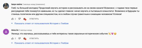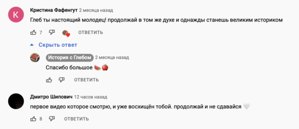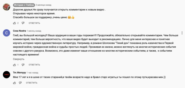 В твиттере и на ютубе в основном хвалят увлечение Глеба историей. К последним роликам на канале комментарии отключены, но в предыдущих есть немало добрых слов и пожеланий в адрес школьника.