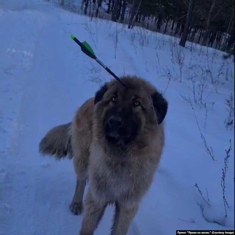 Как рассказали в приюте, зоозащитникам позвонили местные жители, сообщив, что по дороге бежит собака со стрелой в голове. Зоозащитники, которые отловили собаку, увидели, что металлический наконечник от стрелы вошел в голову на несколько сантиметров, часть древка стрелы обломилась, пока пса везли в больницу.