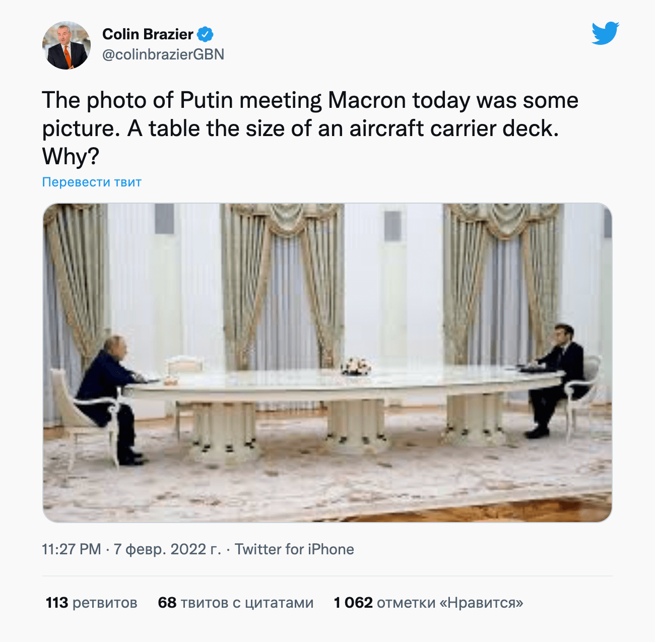 Как бы то ни было, размеры стола впечатлили многих — например, наших западных коллег (но не только их). Вот ведущий британского телеканала GB News Колин Брэйзиер недоумевает, зачем Путину «стол размером с палубу авианосца»?