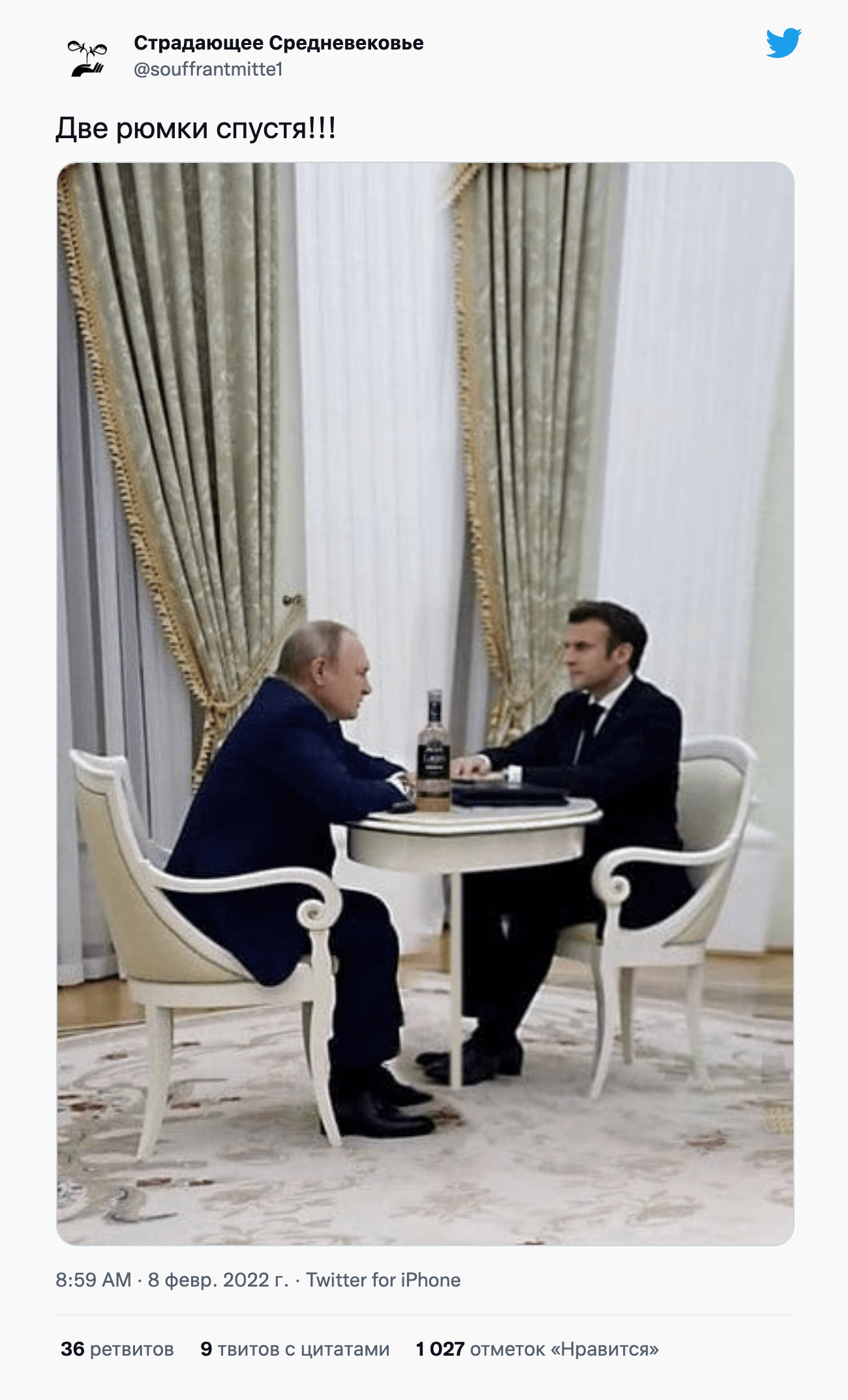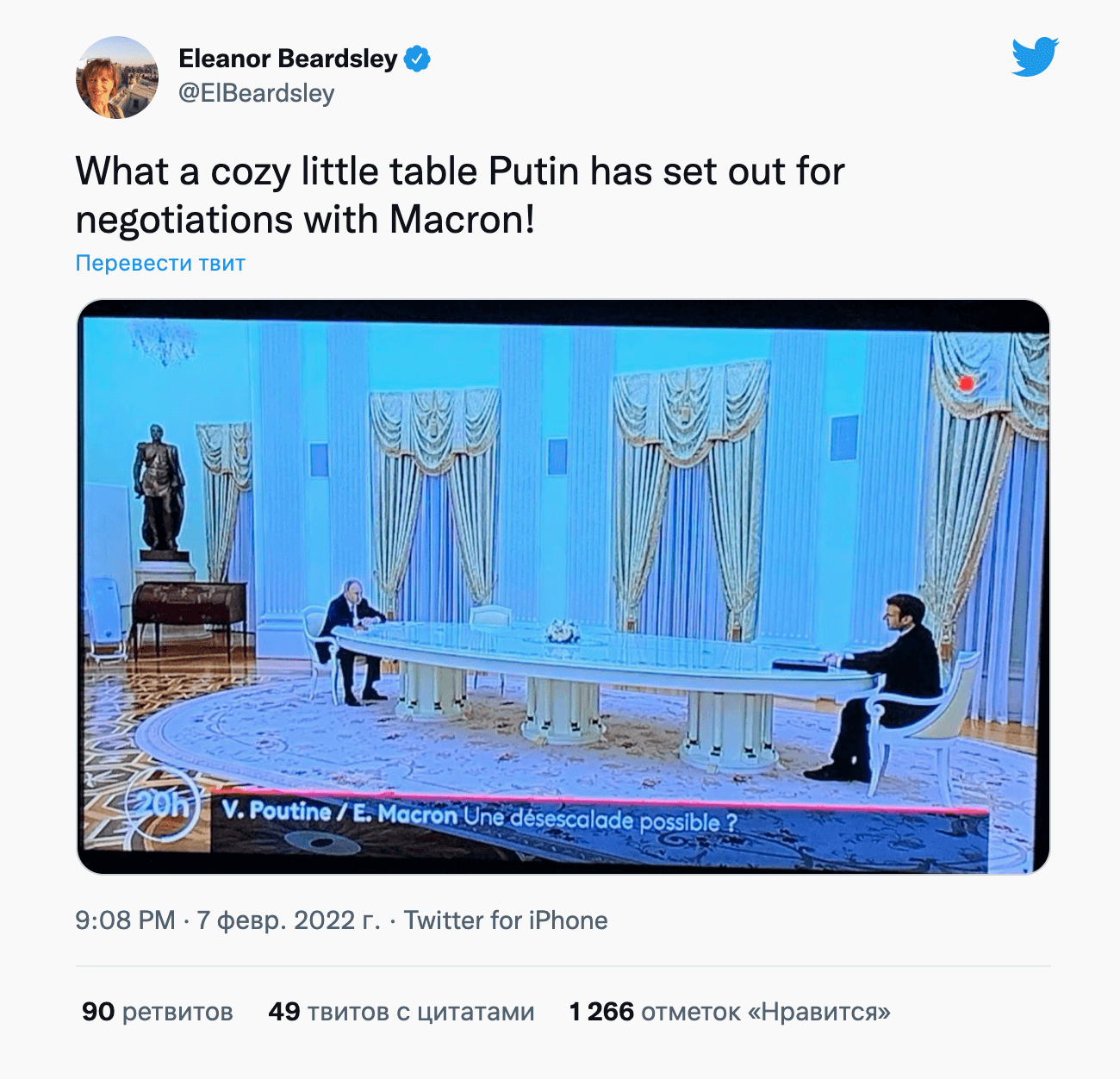 Путин и Макрон: пять часов обсуждают НАТО и Украину. Интернет: ха, смотрите, какой здоровенный стол!