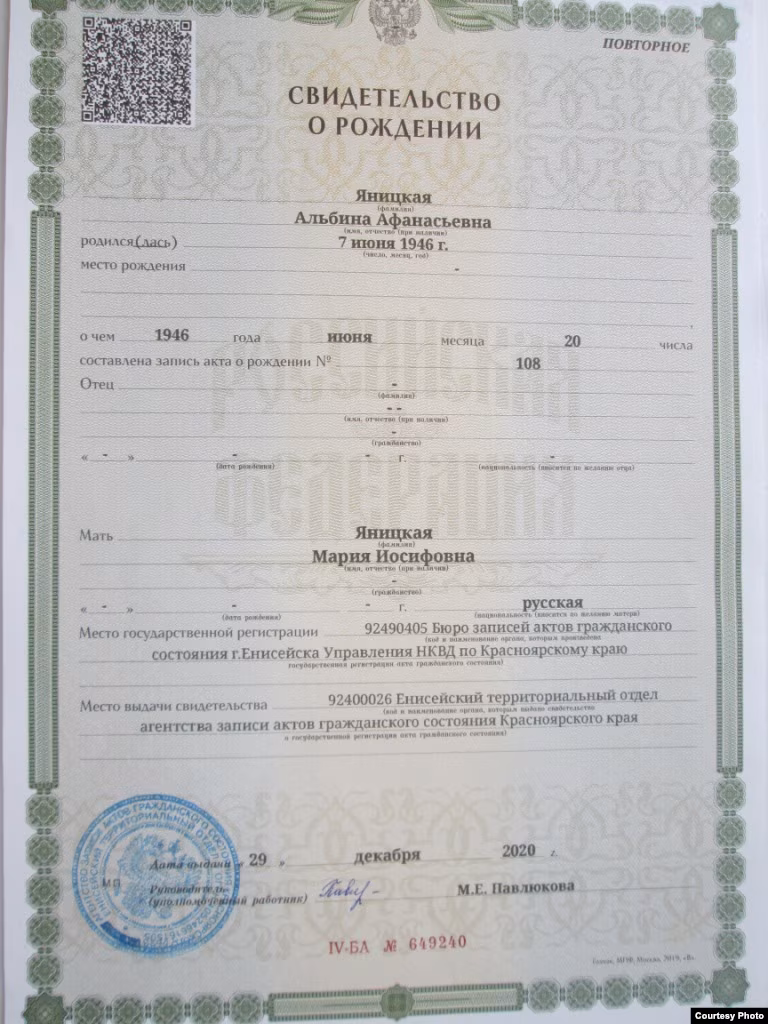 Альбина Яницкая, мать Татьяны, умерла в 2005 году. И пока была жива, совершенно не интересовалась семейной историей, даже отчества своего отца не знала. Упоминала только, что у него когда-то была другая семья. Но после ареста в 1938 году его прежняя жизнь навсегда ушла в прошлое. После освобождения он приехал в Подтесово, где встретил бабушку Татьяны. Они вместе построили дом и воспитали пятерых детей: двоих собственных, девочку-сироту, взятую из детдома, и двоих бабушкиных, от её первого мужа, погибшего на войне. Самое удивительное, что в свидетельстве о рождении у матери Татьяны стоит прочерк в графе "отец".