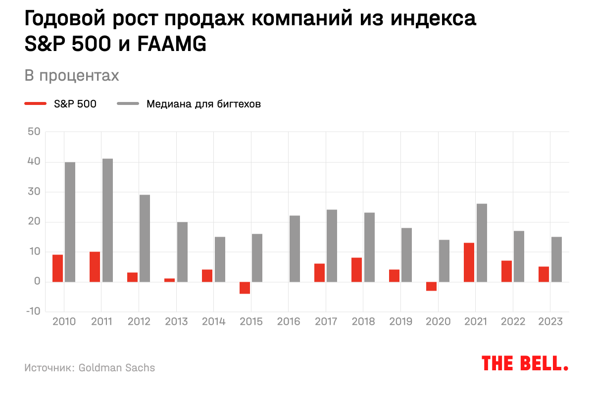 Высокую оценку бигтехов тоже зачастую объясняют ожиданиями того, что они продолжат активно проникать во все новые сферы экономики. Но это же делает бигтехи более уязвимыми к изменениям прогнозов. И такое уже бывало в истории: в течение двух лет после пика пузыря доткомов в марте 2000 года выручка пяти крупнейших компаний того времени (Microsoft, Cisco, GE, Intel, и Exxon), на которые на пике приходилось 18% капитализации всего индекса S&P 500, выросла всего на 8% против ожидавшихся 16%. Когда пузырь доткомов лопнул, оценка резко снизилась. Перед этим показатель EV/sales первой пятерки компаний превосходил EV/sales других 495 компаний из S&P 500 в пять раз — 11x против 2x. Двумя годами позже соотношение изменилось до 6x к 2x.