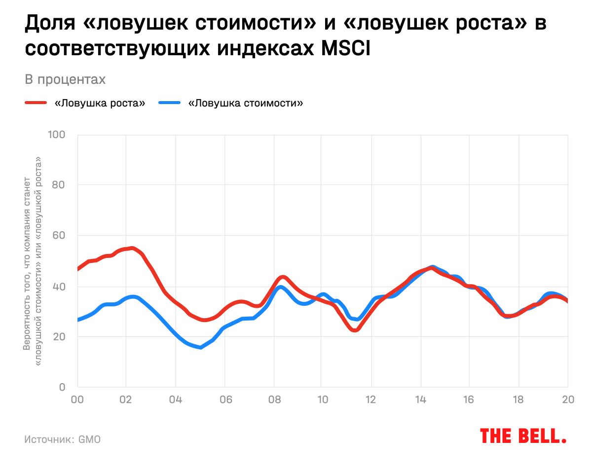 В момент схлопывания пузыря доткомов доля «ловушек роста» оказалась вдвое больше «ловушек стоимости» в соответствующих индексах MSCI, тогда как в спокойные времена соотношение примерно одинаково, подсчитали в GMO.
