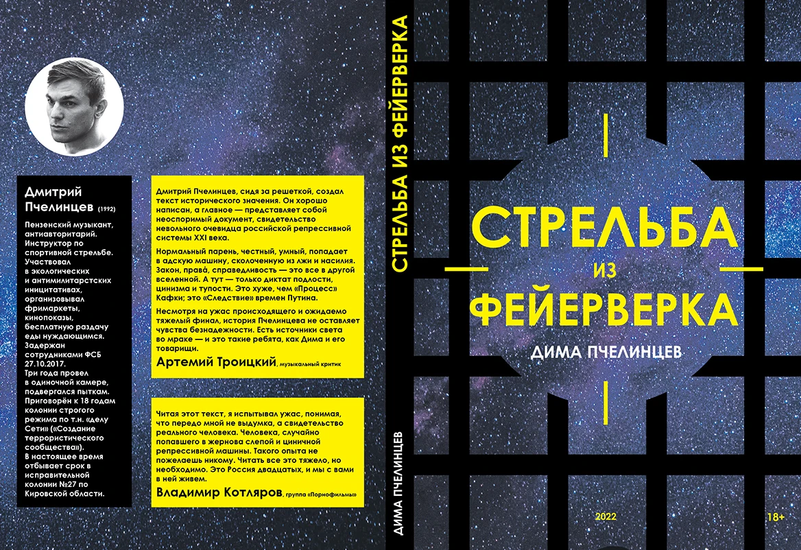 Вышла книга Дмитрия Пчелинцева, осужденного по так называемому «делу «Сети». Он написал ее в тюрьме. Документальное повествование «Стрельба из фейерверка» охватывает период с 2017 по 2020 год, от момента задержания до вынесения приговора — 18 лет лишения свободы.