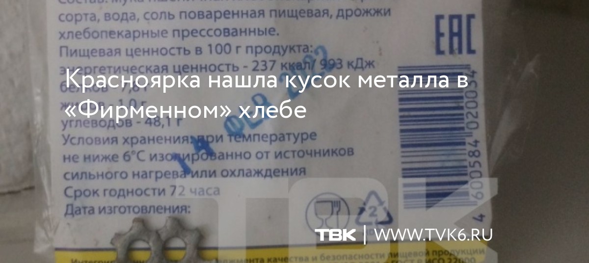 Женщина прислала в редакцию «ТВК Красноярск» фото металлической запчасти, которая, как она утверждает, попалась ей в хлебе, испеченном 14 февраля на заводе «Красноярский хлеб».