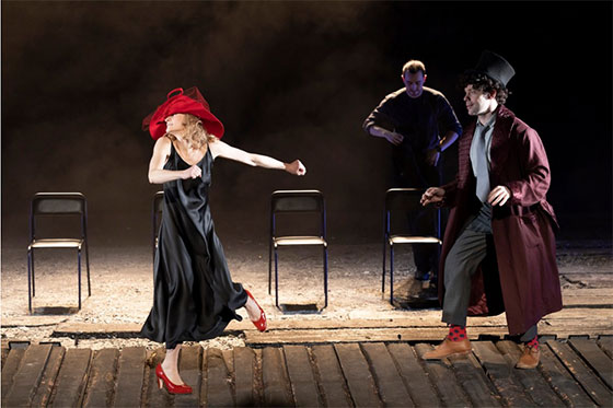 А вот Тимофей Трибунцев конструирует свой туннель из прошлого в сейчас иначе. Он жонглирует в этом спектакле ликами из многих своих ролей, мгновенно подменяя персонажа с плохого на хорошего, как когда-то выглянувший из-за двери Гаррик тасовал чувства на собственном лице. Более того, в какой-то момент Трибунцев даже прихватывает совсем чужое — является райкинско-бутусовским Ричардом с перекошенным от горба торсом и волочащимися ногами. Но великий злодей тут фрагментарен, а вот крымовский Борис и бутусовский же Яго из грандиозной сцены с яичницей на кухне тут демонстрируют себя подробнее, закрепляя основную, по-моему, тему спектакля — о банальности зла. И о маленьких людях, торжествующих его носителях, что буквально манифестировано у Бутусова сильнейшей гневной финальной сценой «Р».