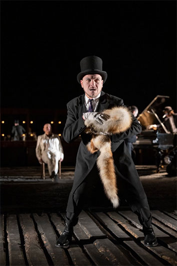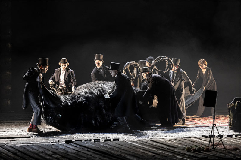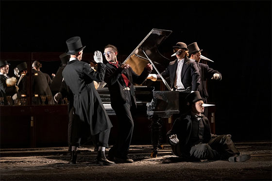 © Театр «Сатирикон» Смертей в «Р», в отличие от гоголевского «Ревизора», предостаточно. Осип Артема Осипова расскажет, как ледышками с одноклассниками долго забивал маленького щенка на школьном крыльце, и гибель Му-му у Тургенева (да и в театральном трюме Театра наций в одноименном спектакле Крымова) покажется по сравнению с этим простодушным самооправданием нестрашной, легкой. А дальше тот же Осип расскажет, как шарахнулся в лес старый Хлестаков, вглядевшись в глаза огромного умирающего лося, сбитого на дороге. У Дурненкова и Бутусова этот жутковатый мотив в спектакле окончательно развернут в небрежном, между делом сообщении городничего Хлестакову о гибели спущенного под лед Добчинско-Бобчинского со всем его семейством — с беременной так и не родившимся Павликом женой да c еще двумя идиотски названными отпрысками. Ярослав Медведев участие в этой изуверской казни страшно сыграл заранее, еще в сцене взятки, когда его Добчинско-Бобчинский, рыдая, всплескивая руками от бессилия, ползает на коленях и обцеловывает ботинки Хлестакова, отказавшегося подписать бумагу, что взял колоссальную коллективную взятку, собранную городом. Не смог повязать круговой порукой нужного человечка — сдохни, неудачник!