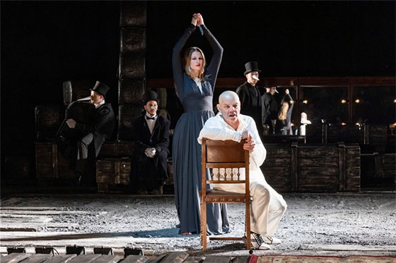 © Театр «Сатирикон» Хлестаков Константина Райкина состарился, путешествуя из гоголевских времен в нынешние, которые его и прикончат. Уже не Осип ему, а он Осипу говорит, что надо валить из городишка, потому что жареным пахнет. Он все понимает, лениво, не без тоскливой скуки в стопятьдесяттысячный раз играет свою роль безо всяких даже элементарных фантазий (и тут явный оммаж «Тарарабумбии» — райкинский Хлестаков вполне был бы уместен на крымовском сценическом транспортере) и уже не волочится за хорошенькими женщинами. И нонешние законы отлично знает, опасность сразу чует, нервишки шалят, трусит, уже не жить — выжить желает. Нелепо такому дьявольски многомудрому Хлестакову приписывать авторство дурацкого письма, вскрытого почтмейстером. Сам почтмейстер его и написал, вспомнив пьесу. У Николай Васильича сплагиатил.
