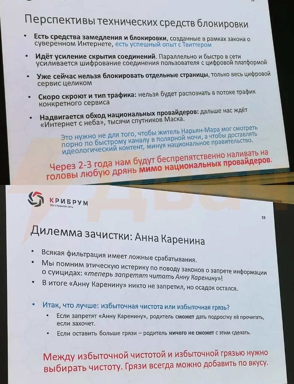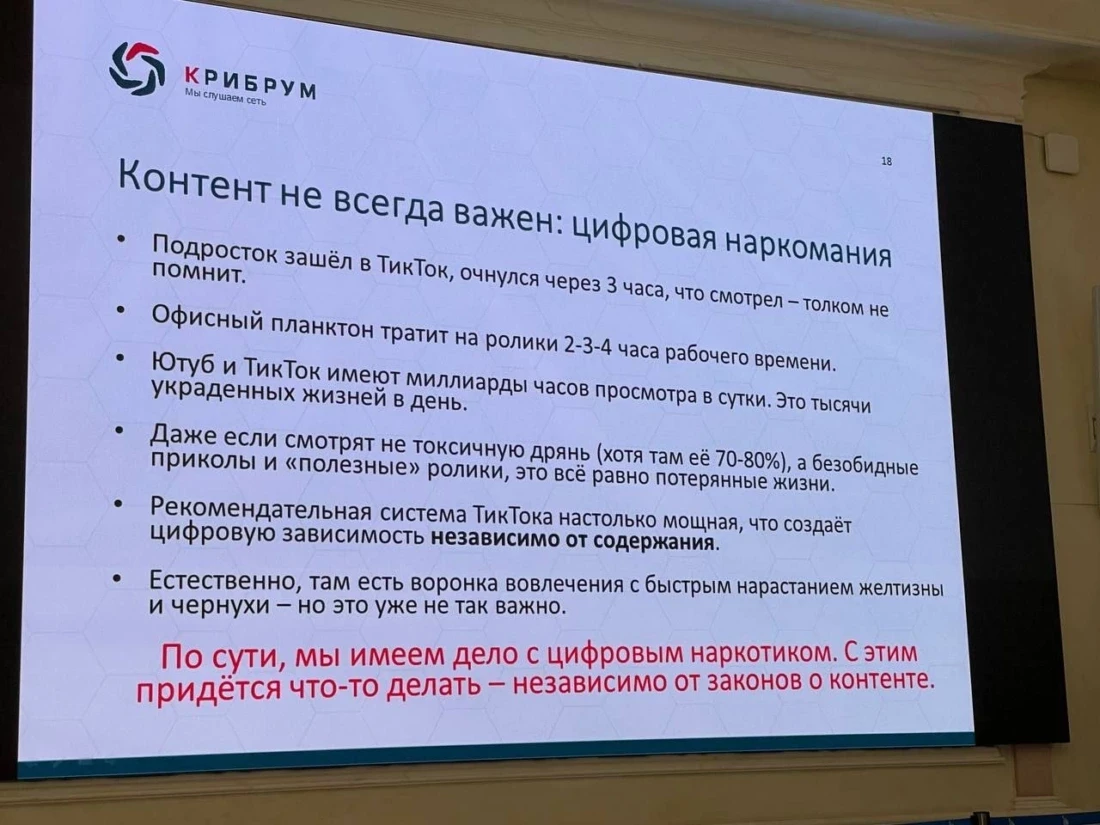Исследователи «Крибрума» выделили направления «деструктивного контента». Среди них — пропаганда ЛГБТ, абортов, феминизма и чайлдфри. Ашманов предложил блокировать и убирать такой контент с платформ, иначе велика вероятность, что «нам будут беспрепятственно наливать на головы любую дрянь мимо национальных провайдеров» через «спутники [Илона] Маска» (имеется ввиду глобальная спутниковая система Starlink). Авторы презентации уделили особое внимание видео-сервисам — Youtube и TikTok. По их мнению, такие площадки являются «цифровыми наркотиками».